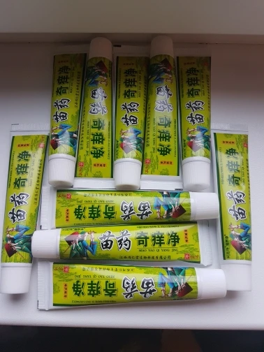 Товар соответствует описанию. До Москвы доставлялась 3 недели. Мазь находится в маленьком зеленом тюбике. Все надписи на китайском, так что состав искать только по интернету. Действие. При нанесении на поврежденный участок кожи сильно жжется. Пахнет сильно, деже не определить чем. Заживление атопического дерматита происходит. Жена намазала натертость от ботинок на ночь и на утро уже был эффект. Рекомендую, это действительно очень интересная мазюка, которая утирает нос дорогущим и бестолковым акридермам