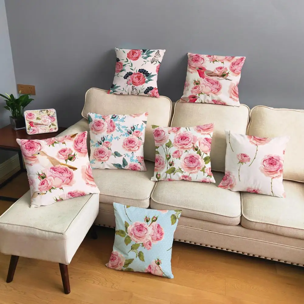 Чехол для подушки в нордическом простом стиле с розовыми розами, цветами, птицами, плюшевыми растениями, 45x45 см, наволочка для подушки с мультяшным цветочным принтом, декоративный чехол для подушки