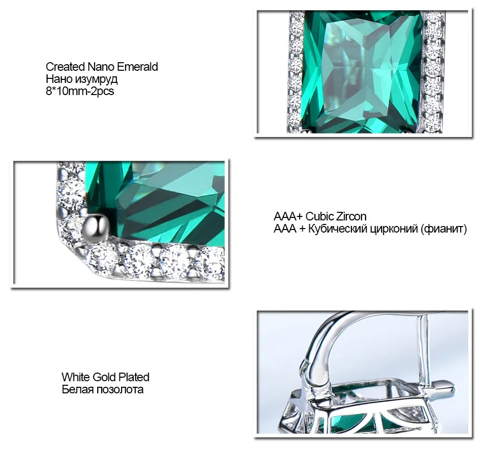Серьги-клипсы женские прямоугольные из серебра 925 пробы с изумрудами