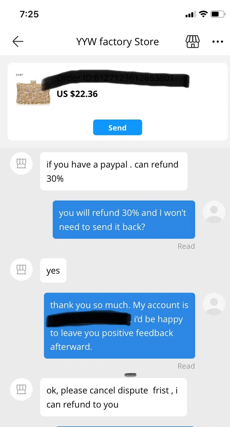 Я больше никогда не буду покупать у этого продавца. Это первый и, надеюсь, единственный раз, когда я оставляю отрицательный отзыв. Я заказал сумочку, и они отправили не тот цвет. Я связался с продавцом, который сначала запросил фотографию. Затем второе фото. Я дал оба. Затем продавец попросил меня предоставить мой PayPal, и они отправят мне 30% возврат, и мне не придется возвращать его, но мне пришлось отменить спор. Я сказал продавцу, что отменю после получения возмещения. Продавец отказался вернуть деньги и не связался, они просто хотели, чтобы спор закончился. Aliexpress закончила спор, восстановив мои деньги. Я больше не буду иметь дело с продавцом. Смотрите скриншоты разговора.