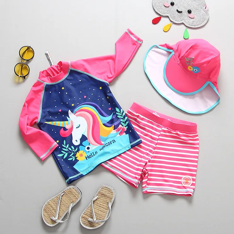 Детский слитный купальник для девочек, с принтом единорога, с шапоч...