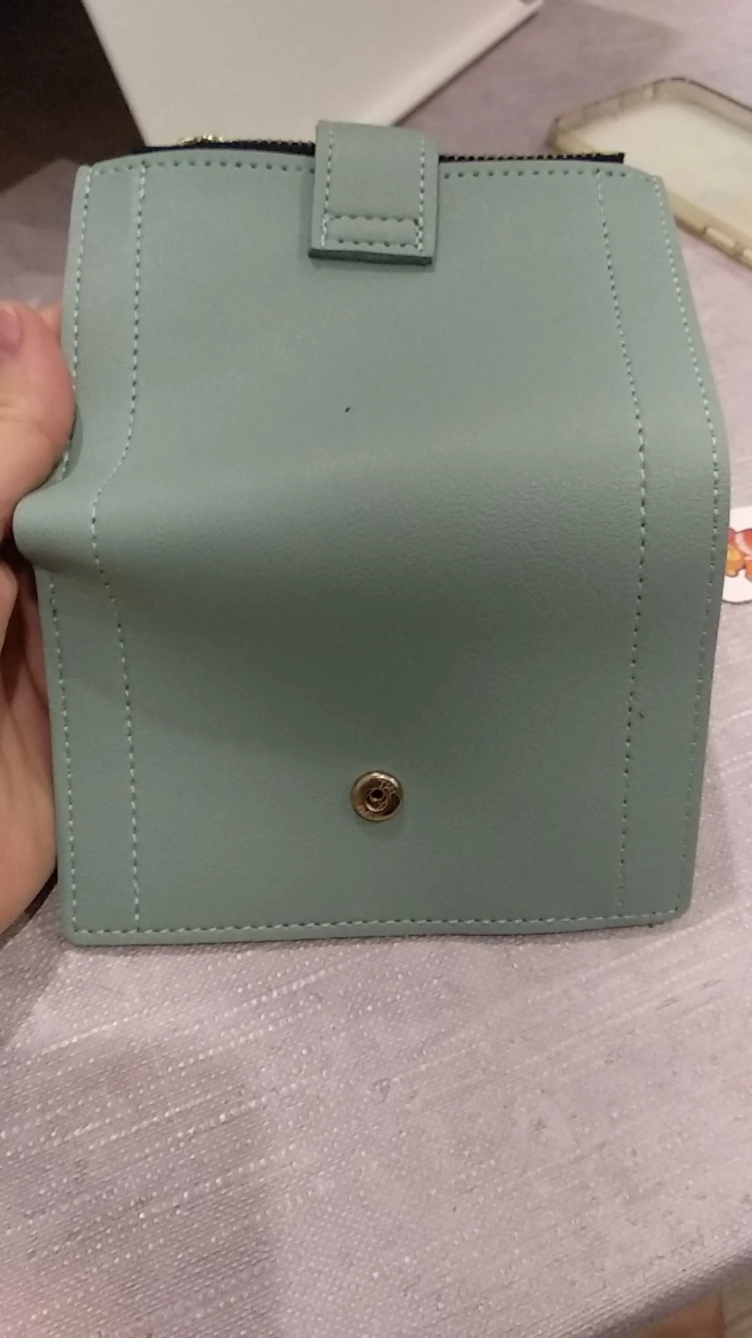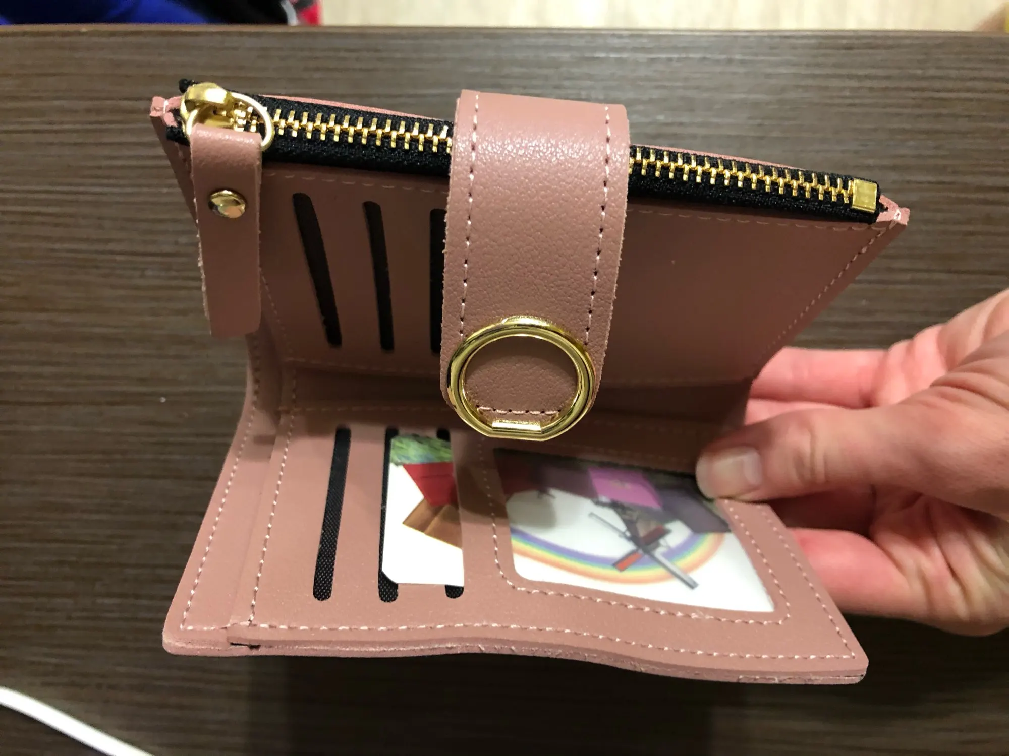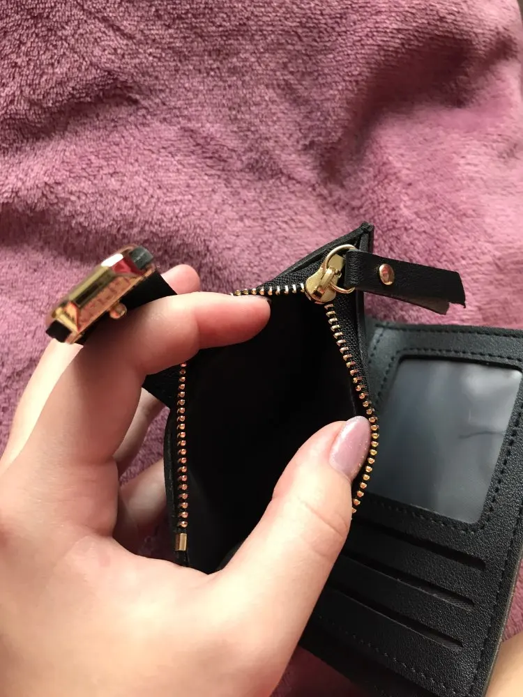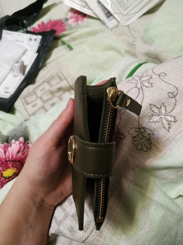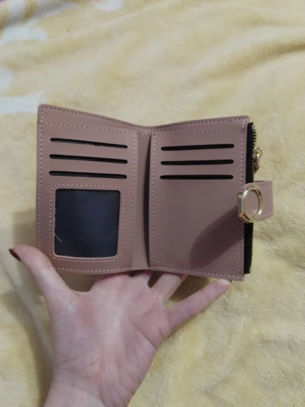 Неплохой кошелек, правда материал оказался мягче, чем я ожидала. Довольно вместительный, красивый дизайн, посылка пришла быстро.