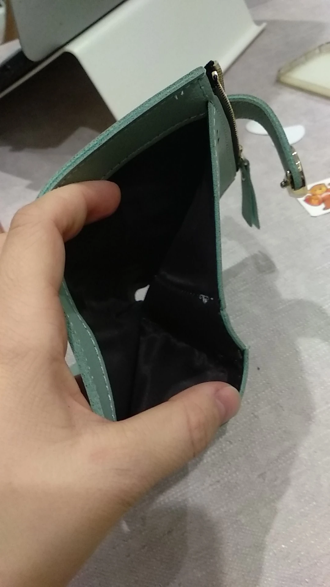 цвет очень классный, хаки, не темно-зеленый, как тут пишут. пришел быстро, за 15 дней(25.12-8.01), объединили с другими посылками. Воронеж. я выбирала платную доставку за 60 рублей. качество среднее, внизу вон подкладка не прошита, дырочка эта меня смущает, и нитки немного торчат. подкладка тонкая и очень шуршащая. молнии, заклепки работают хорошо. сам кошелек тонкий. не думаю, что он долговечный. внутри паролончик положили и бумажку. в целом, я довольна покупкой