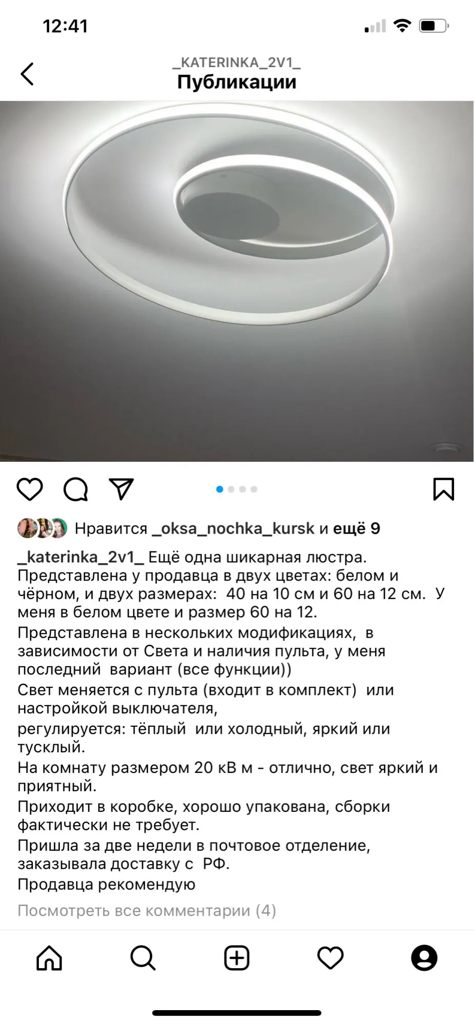 Люстра огонь, даже не ожидала такого!!! Совсем не маленькая, как на картинках, свет регулируется с пульта: теплее, холоднее, ярче, темнее!!! Очень довольна покупкой, шла около двух недель из Иркутска. Всем советую!!!