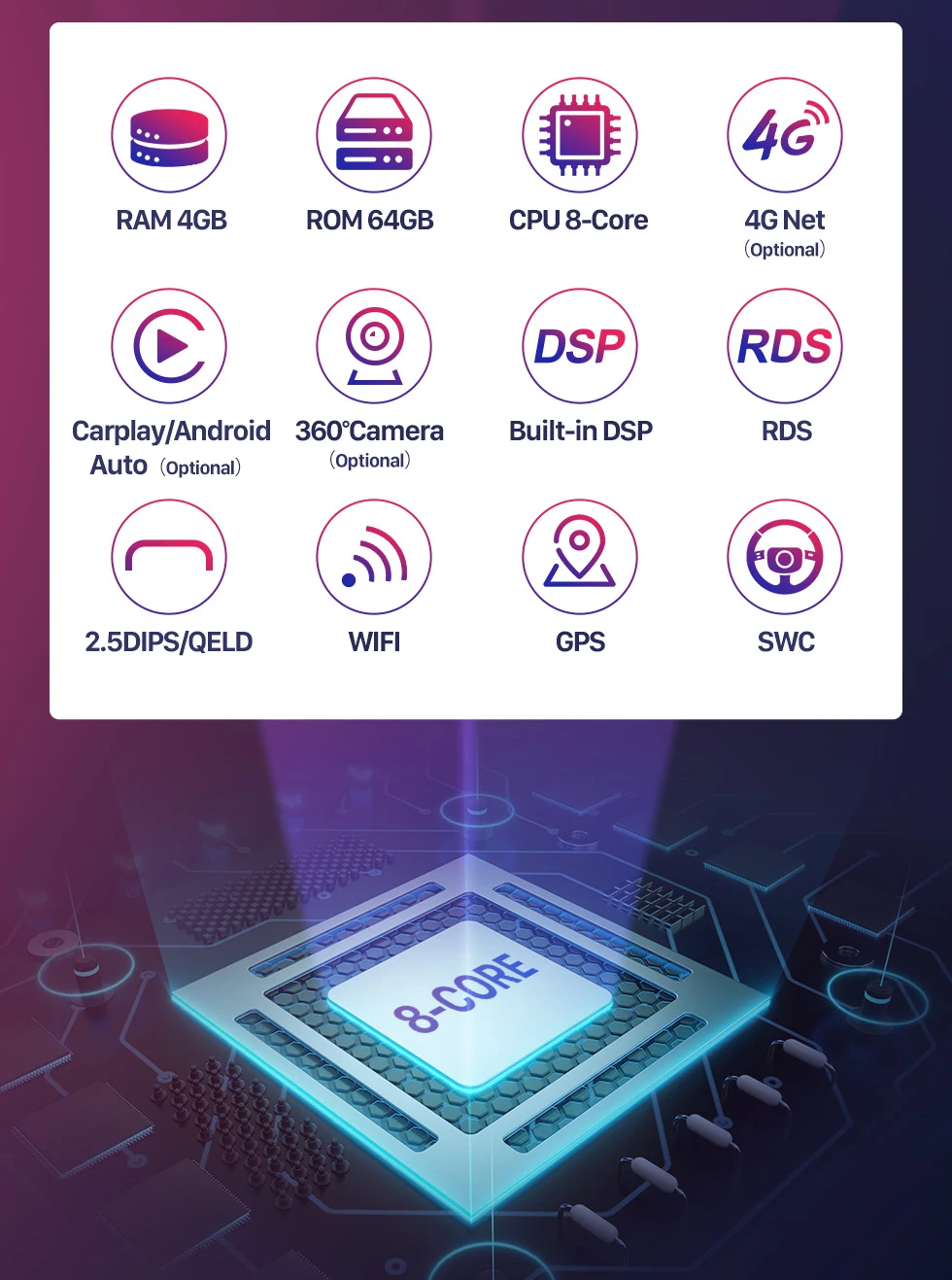 КонфигурацияОС: Android 10,0 API = 29Процессор: Восьмиядерный 2,5 ГГцОперативная память 4 Гб DDR4 ROM 64 ГБЭкран: 10,1 дюймов 2.5D QLEDmulti-touch экранС DSP 36EQУсилитель: Встроенный CarplayПоддержка 360 градусов камеры RDS, 4G и WiFi/загрузка приложений/3D-навигация/радио тюнер/Bluetooth/Двойная зона/управление файлами/HD 1080P видео/Управление рулем/Mirror Link/OBD2/DVR/камера заднего вида/MP3/USB/SD и т. д.Рабочая температура:-30 ~ 80 ℃