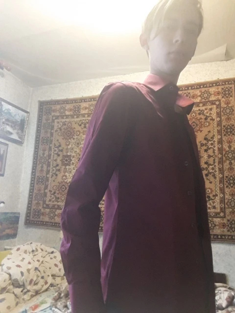 сын сразу уволок. ходит на учебу и радуется. цвет более винный, чем на моем мониторе, но так лучше, стильнее. рубашка шелковистая на ощупь, очень приятная. швы ровные, аккуратные. очень хорошая рубашка, похоже, что станет любимой!