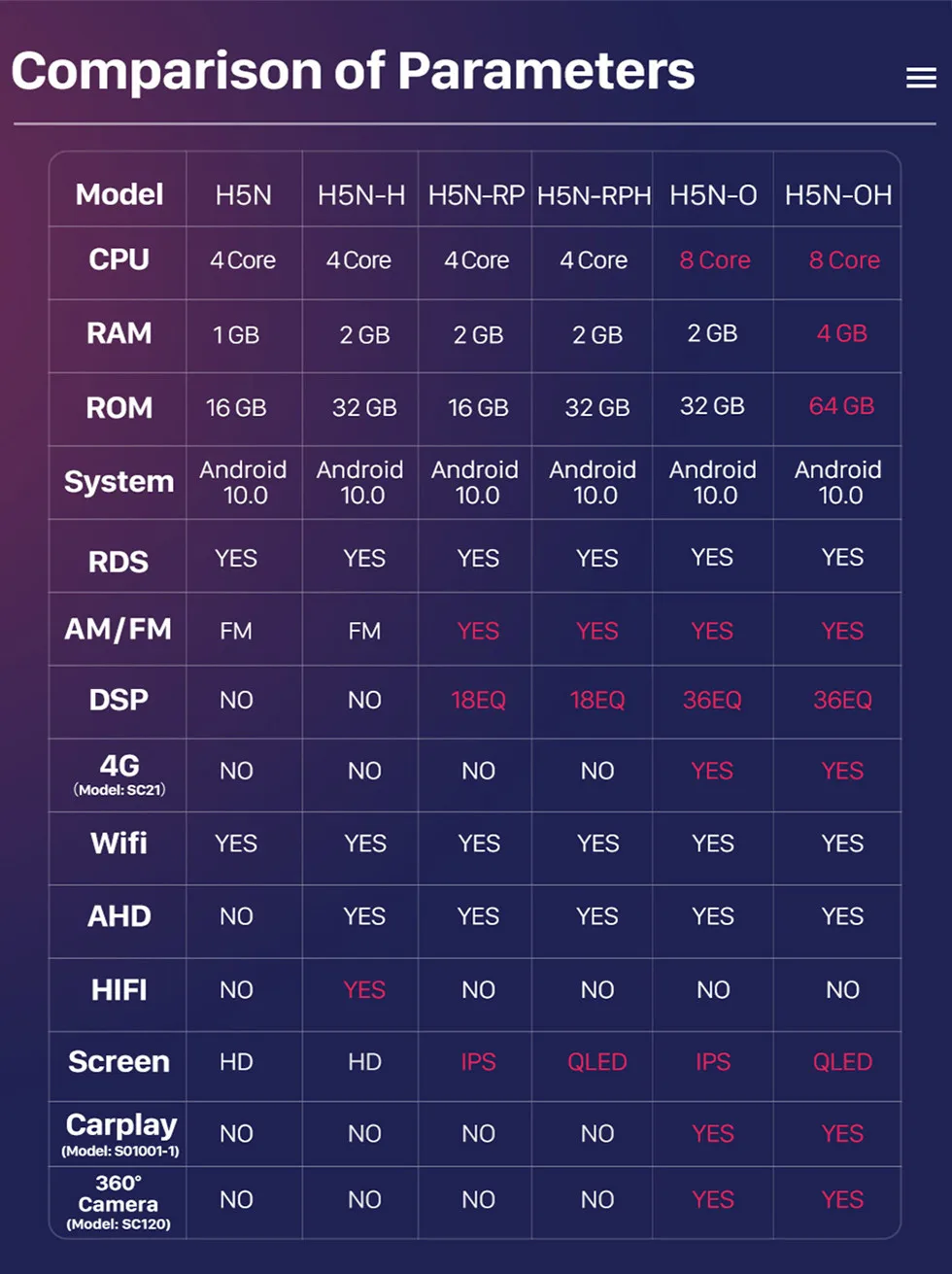 КонфигурацияОС: Android 10,0 API = 29ЦПУ: Восьмиядерный 2,5 ГГцRAM 4GB DDR4 ROM 64GBЭкран: 9 дюймов 2.5D QLEDmulti-touch Screen screenС DSP 36EQУсилитель: ST 7850; Радио IC:NXP6856 встроенный CarplayПоддержка 360 градусов камеры RDS, 4G & WiFi/загрузка приложения/3D-навигация/радио тюнер/Bluetooth/Двойная зона/управление файлами/HD 1080P видео/Управление рулевым колесом/зеркальная Ссылка/OBD2/DVR/резервная камера/MP3/USB/SD и т. д.Рабочая температура:-30 ~ 80 ℃
