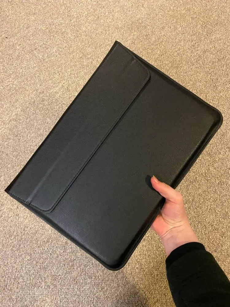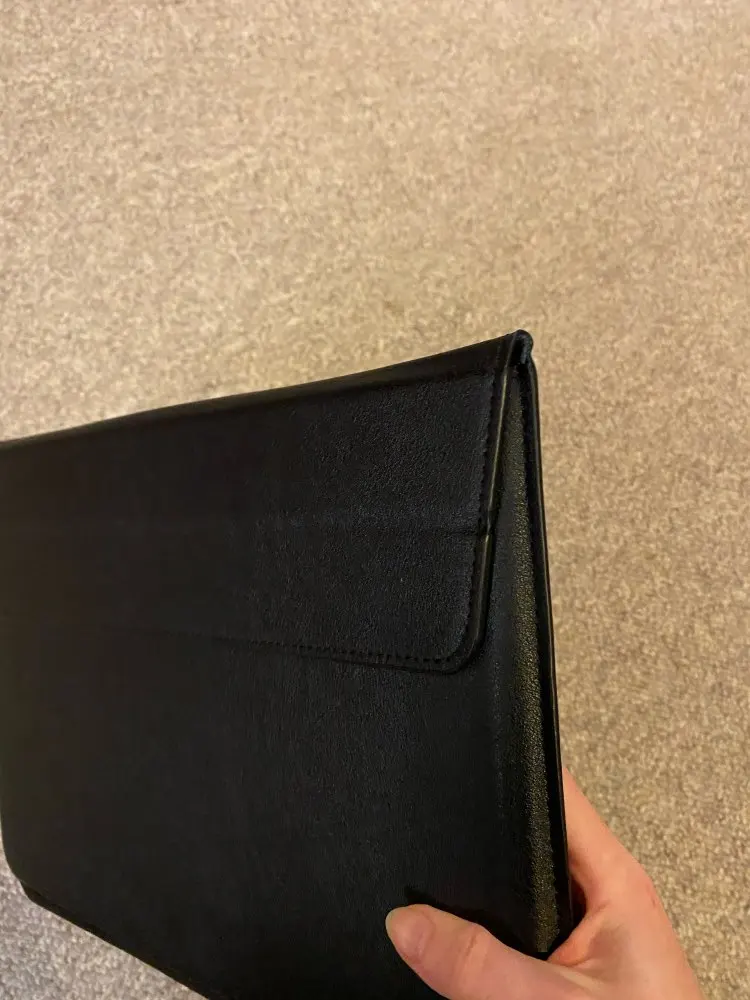 Очень милый чехол. Я беспокоился, что черный цвет будет выглядеть дешево, но на самом деле он выглядит очень стильно и дороже, чем он был. Это немного остроконечно в верхних углах, но это не большая покупка. Магнит работает красиво и работает как стенд, как рекламируется. Кроме того, продавец сказал мне, что этот чехол все равно подойдет к моему ноутбуку, когда он был жесткий, и это стало правдой. Я беспокоился, что он будет слишком мал, но он хорошо сидит! Я рекомендую этот чехол.