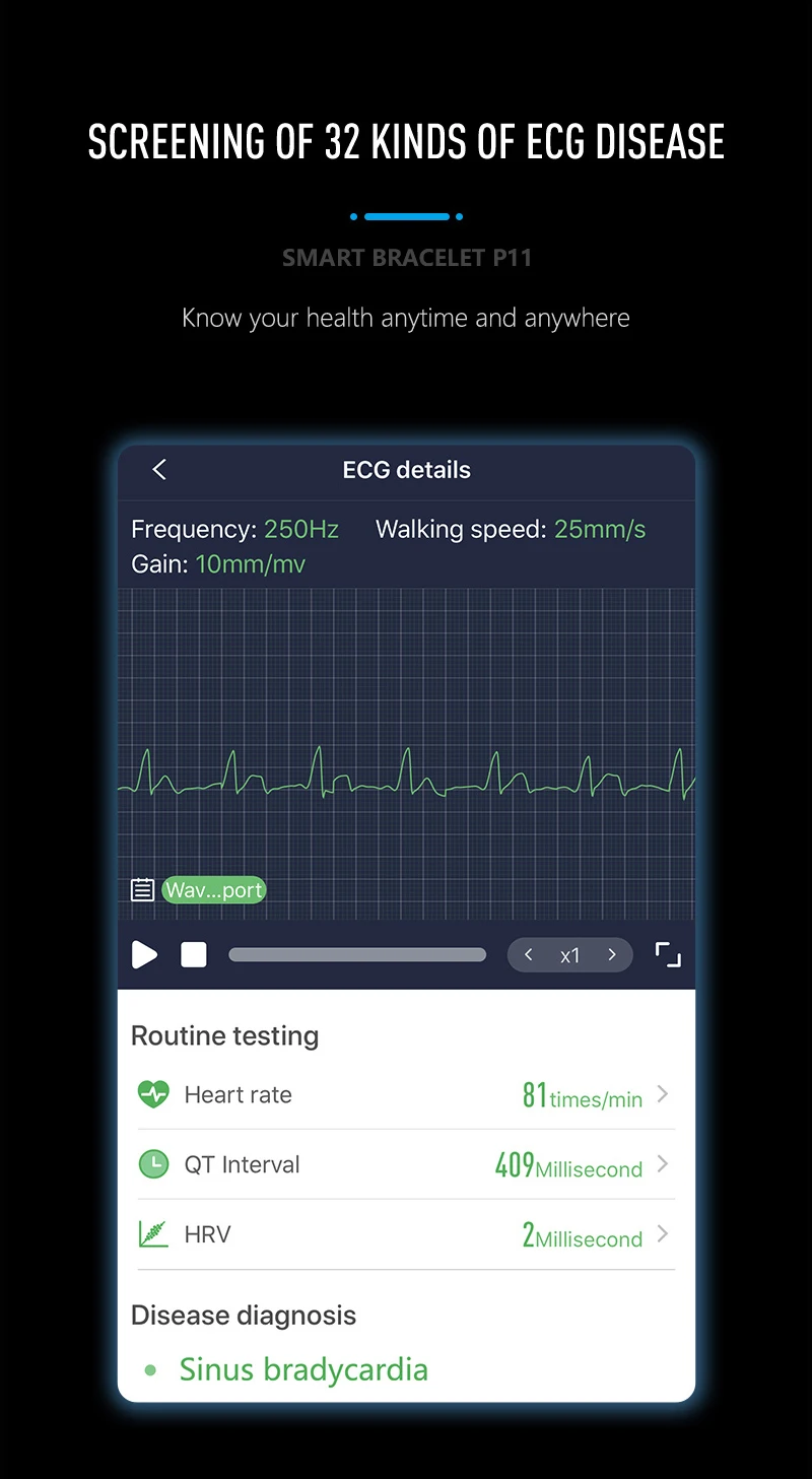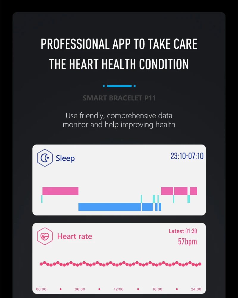 Основные характеристики: Отображение спортивных данных ● Для управления здоровьем, сохраняя данные в течение 30 дней. Шагомер, поддержка времени занятий спортом, расчет калорий Монитор артериального давления ● Устройство будет измерять кровяное давление один раз в час, если включить кнопку «острое-часовое Измерение» в «устройство управления», как только оно успешно подключено. Вы также можете вручную измерить BP с устройства. (Данные только для справки) Монитор сердечного ритма ● Устройство будет измерять частоту сердечных сокращений один раз в час, если включить кнопку «Измерение острых часов» в «Управление устройством», как только устройство подключено успешно. (Данные только для справки) ECG & PPG • 24-часовой непрерывный мониторинг и анализ поток крови под кожу с зеленым светильник датчик светодиодный светильник, сердечный ритм отображается в режиме реального времени с помощью фото электрическая духовка объема пульсовой волны метод трассировки. (Данные только для справки) Режим сна ● Во время сна группа автоматически контролирует, как долго и как хорошо вы спите. Пожалуйста, установите время сна из «личной информации». (Пожалуйста, носите браслет во время сна, чтобы записать данные о вашем сне) Напоминание ● Поддержка сигнализации, питья воды, сидения, звонков, SMS (сообщения, QQ, Wechat, Skype, Facebook, Twitter, Line, Whatsapp), напоминания о потере. Часы будут напоминать вам с вибрацией. (включите кнопку уведомления от «Управление устройством-напоминание» Прочие Функции ● Время, удаленная камера, найти браслет, шагомер, вибрационное напоминание, анти-потеря, расстояние расчета будильника. Секундомер. Язык приложения ● Китайский, английский, японский, корейский, испанский, немецкий, итальянский, французский, греческий, русский, голландский, португальский. Умный Браслет ● Китайский, английский. Приложение и браслет ● Найдите «H Band» в app Store или отсканируйте qr-код и загрузите «H Band» ● Название устройства: P11