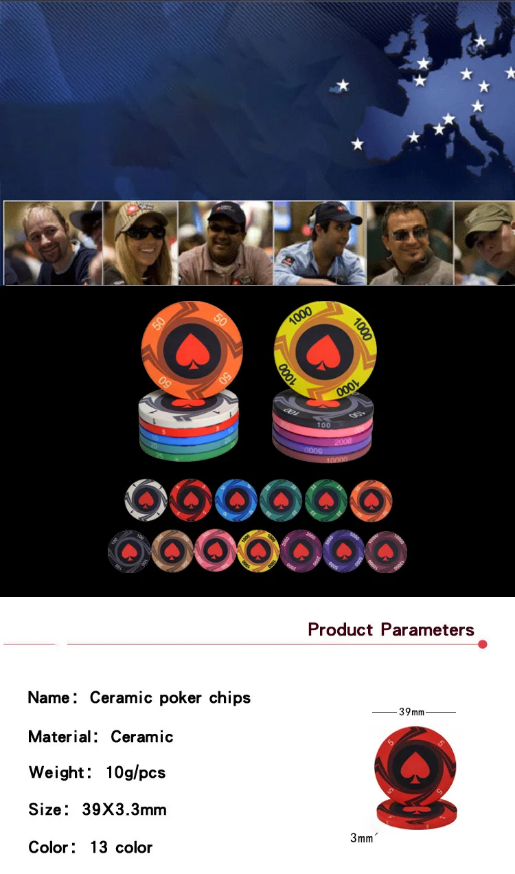 Пожалуйста, обратите внимание:Мы не можем использовать оригинальную картинку, но у нас есть предыдущие чипы в наличии. Если вам нравятся чипы EPT, свяжитесь с нами для получения предложений. Мы отправим вам предыдущие чипы после того, как вы разместите заказ. Фото настоящих чипов Посмотрите отзыв покупателейСоветы: Наименование и количество могут совпадать. Вы можете разместить заказ всех лотов в одном номинале и оставить сообщение, которое вам нужно, количество и номинал, мы отправим вам по вашему запросуЕсли вы хотите больше, пожалуйста, свяжитесь с нами и получите лучшую цену.Мы также поддерживаем настройку покерного чипа, но цена будет дороже обычных покерных чипов. Название: Керамический покерный чип EPT Размер: 39 мм x 3,3 мм Материал: керамика Вес: 10 г/шт. MOQ:25 шт./лот