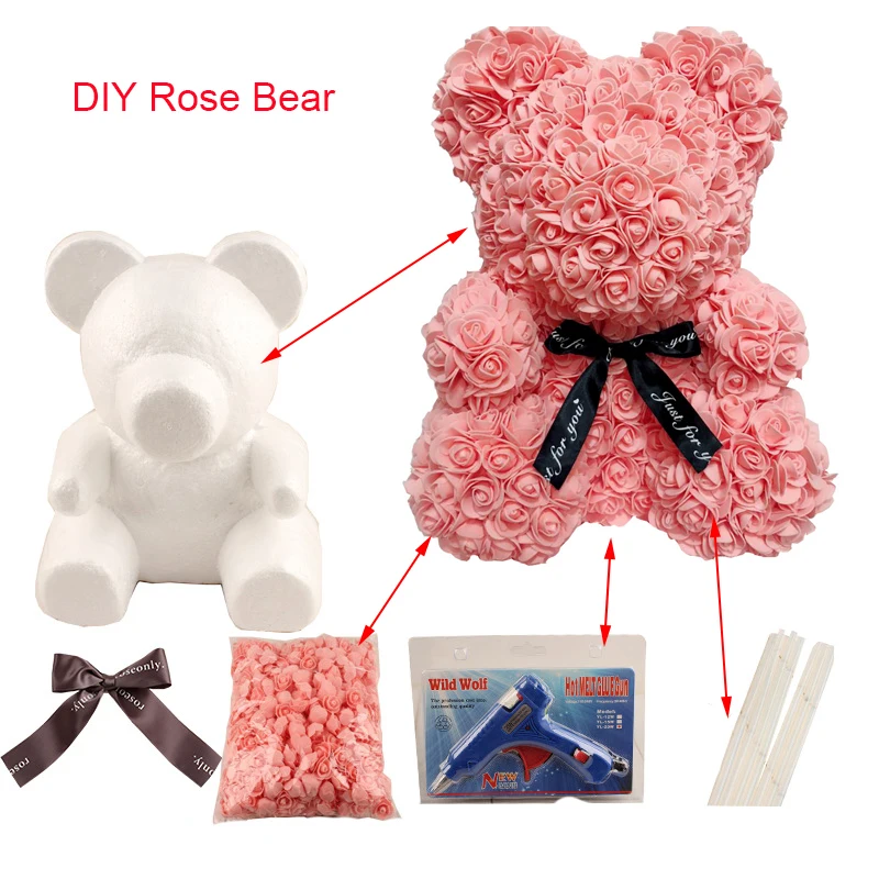 3. Размер: Медведь Высота: 20 см/33 см, собака удачи: 35*25 см. 4. Упаковка: клеевой пистолет: 1 шт., посылка:1*1 комплект (1 шт. клеевой пистолет + 12 шт. клеевой карандаш + 500 шт. ПЭ цветок розы + медведь/собака удачи плесень)