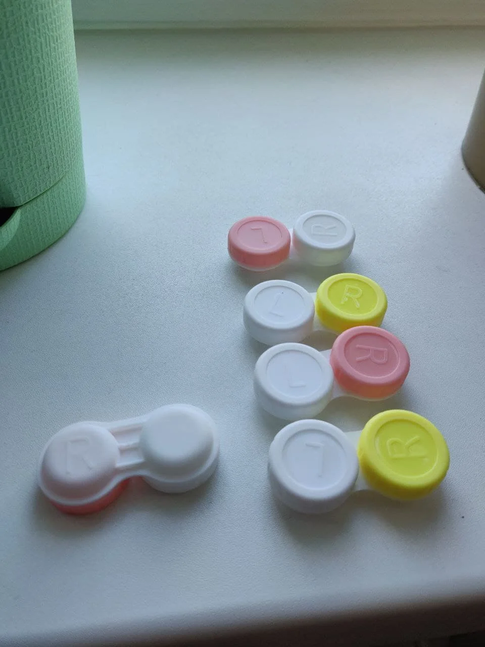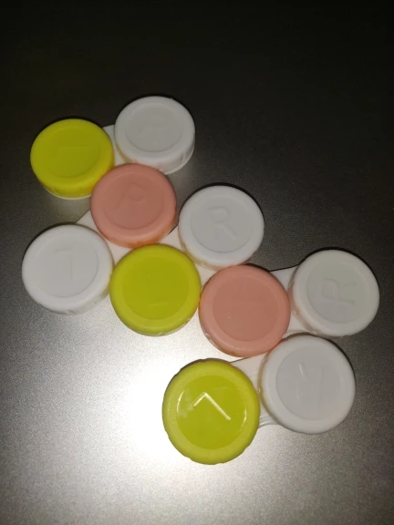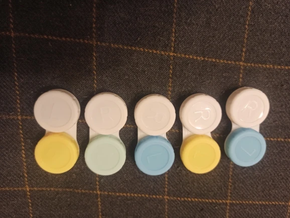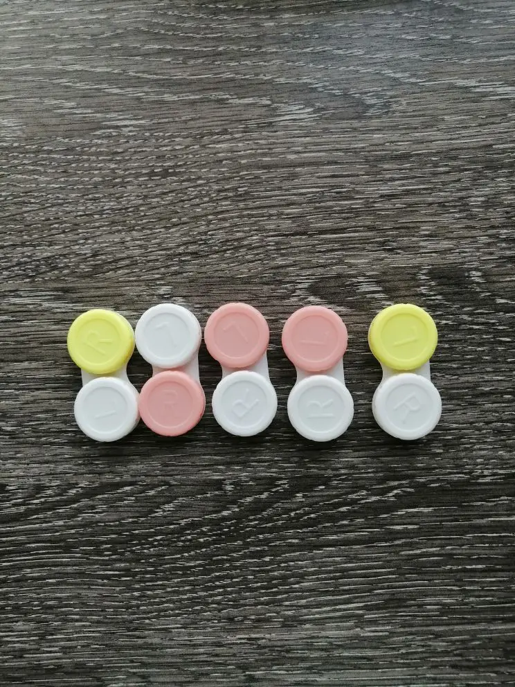 Очень красивый держатель для контактных линз. С L и R на крышке. Цветной и белый, соответствует ожиданиям.