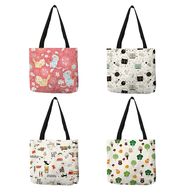 Коллаж с мультяшным котом, дизайнерская женская сумка рисунок, льняная прочная уличная сумка через плечо, повседневные многофункциональные сумки-тоут
