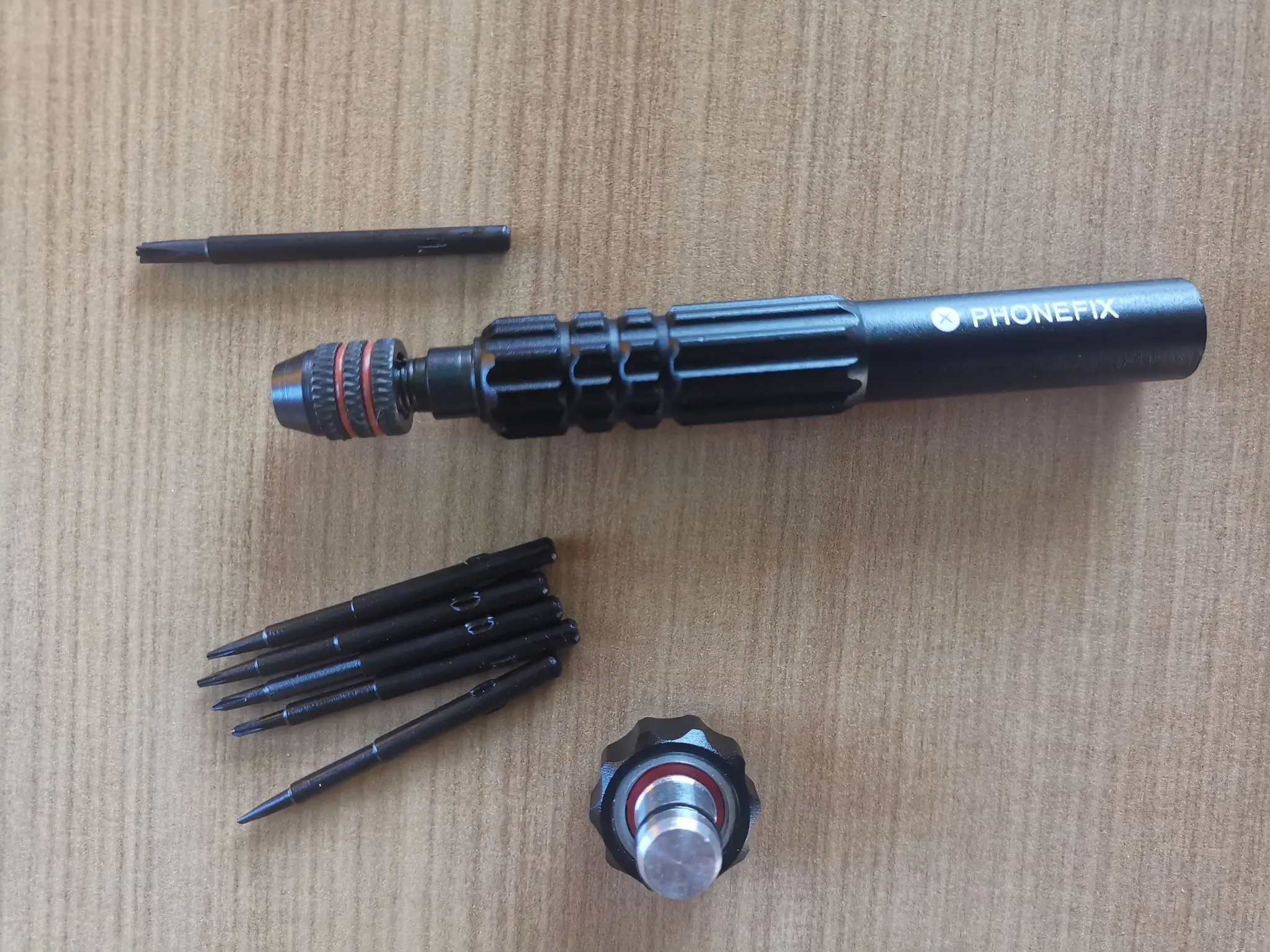 Биты в комплекте: 1,2 мм (+) /0,6 мм (Y) /2,5 мм (указано Phillips) /0,8 мм (★) / T2 Torx/1,5 мм (-)