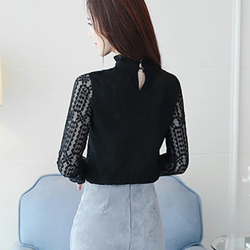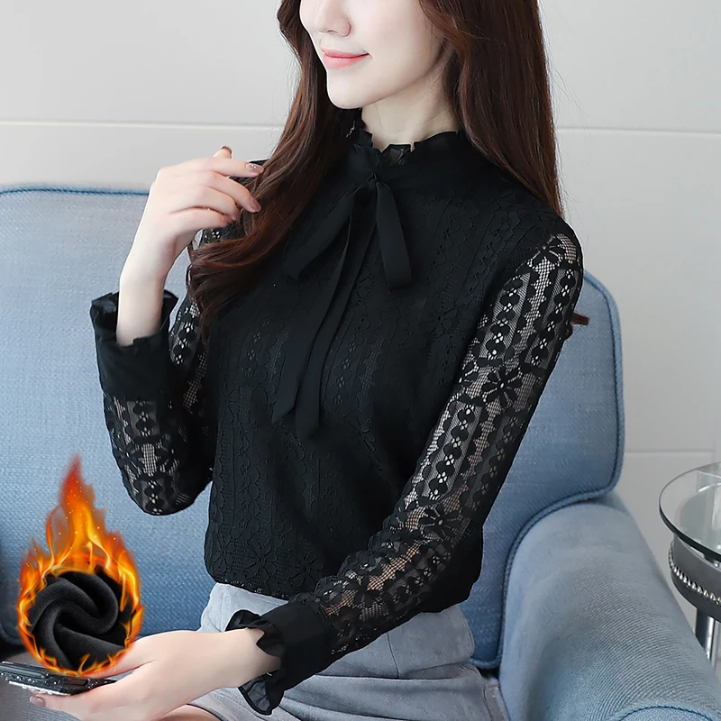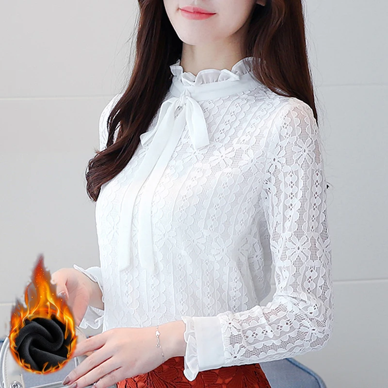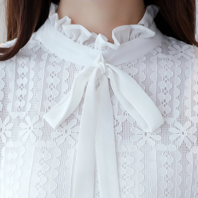 женские элегантное платье с длинным рукавом кружевные блузы Новый 2019 Большие размеры Для женщин одежды, рубашка с белым кружевным бантом топы с вырезом Основные рубашки S-3XL 608i3
