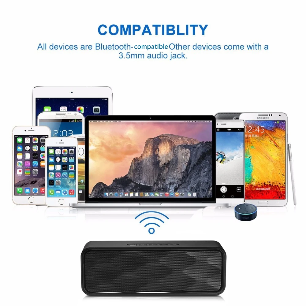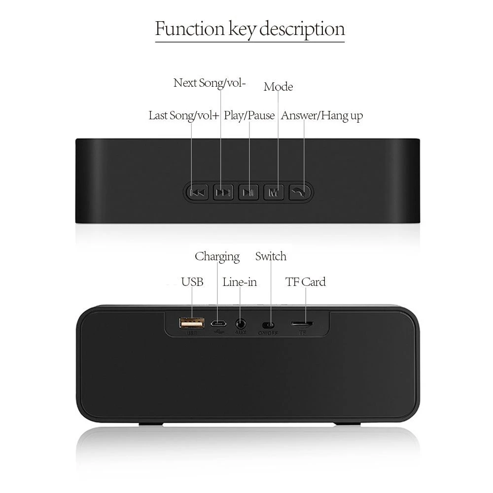 Особенности:1. Модный высококлассный внешний вид, популярные линии чувств. Два динамика 4 Ом 3 Вт с полнодиапазонными динамиками и оснащены мощной басовой диафрагмой, не зависящей от полости динамика, идеальной интерпретацией всех видов музыки, подходит для всех любящих людей, чтобы купить музыку, красивый звук, легко носить с собой.2. Bluetooth-Совместимость 4,2 беспроводная передача, чтобы решить обычный длинный провод кабель короткий, проблемы! Беспроводной, например, куда положить.3. Вы можете ответить на телефон, подключить телефон с помощью Bluetooth, колонки с микрофоном, вы можете легко использовать, нулевое излучение, тело хорошее.4. С функцией fm-радио, очень удобно использовать.5. Можно подключить tf-карту и U диск MP3-плеер для воспроизведения музыки.6. Внешний вид нового, АБС-пластик + железная сетка + силиконовый коврик продукт, идеальное литье, текстура необыкновенная мода. Поддержка настольного ПК, мобильный телефон и различные компьютеры и другие устройства Bluetooth-совместимая Беспроводная передача аудио.Характеристики:1. Совместимость с Bluetooth версия: 4,22. Функция: Bluetooth-Совместимость с операционными подключение, поддержка TF карты, u-диск, FM радио, не занимает руки (встроенный микрофон)/Aux кабель/USB кабель/3,5 мм соединение3. Динамик: двойной динамик s 40 мм 4Ω 3 Вт * 2, с басовым пассивным динамиком4. Чувствительность: ≤ 1%5.SNR: ≥ 85 дБ6. Номинальная мощность: 3 Вт * 27. Расстояние передачи: 10 метров8. Емкость аккумулятора: 1800 мАч9. Время игры: до 6 часов9. Номинальное напряжение: 5 В постоянного тока10. Время зарядки: 2,5-3,5 часовРегулятор громкости:Для кнопки «previous' и «next», одним нажатием является «Предыдущий Song» и «next Song»Удерживайте нажатие «Уменьшение громкости» и «Увеличение громкости»Соединение, совместимое с Bluetooth:1. Кнопка включения/выключения2. Используйте устройство для открытия функции, совместимой с Bluetooth, и найдите «динамик 4,2», динамик подскажет успех подключения.USB флеш-накопитель/tf-карта:1. Вставьте флеш-диск USB/TF и подсказку динамика «Воспроизведение через usb-накопитель»/«воспроизведение по TF'2. Динамик будет искать файл и играть автоматически.Примечание: Пожалуйста, выберите бренд tf-карты или USB флэш-накопитель для вставки устройства.Aux/аудио кабель:При вставке 3,5 мм аудио кабель, динамик предложит 'Aux input'Вход Aux может воспроизводить источник musci.Посылка включает:1 xBluetooth-совместимый динамикКабель AUX-1 шт.1 х USB кабель для зарядкиРуководство пользователя (на русском и английском языках)-1 шт.