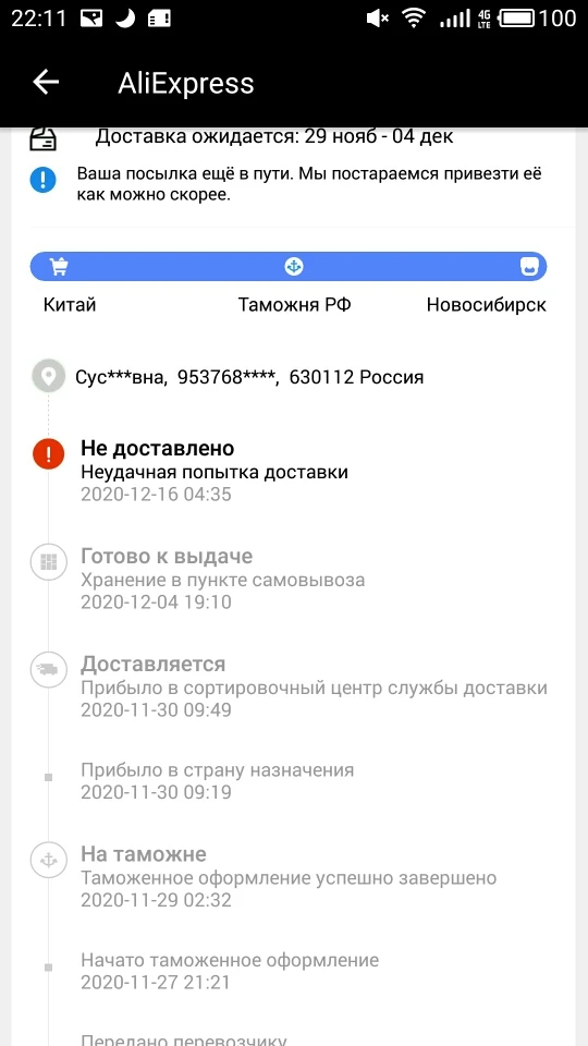 На момент заказа была обещана быстрая доставка за 10 дней от AliExpress, т.е. обещал её не магазин. Оформила заказ 12.11.20г., на следующий день посылка была готова к перевозке и до 23.11.20г.(!) хранилась в сортировочном центре. Как выяснилось позже, объединяли 6 заказов от разных продавцов в одну. Доставка была через курьерскую службу PickPoint, будь он не ладен , потому что посылку я так и не получила( В тот самый день, когда посылку из 6 тоаров доставили в постамат, через 2 часа он сломался и не работал следующие 2 недели. Техподдержка ответила только один раз, объяснив ситуацию кибер атакой, обещали увеличить срок хранения. Вот только не увеличили((( Самостоятельно можно было продлить только разово и на 3 дня максимум, чем я и воспользовалась безуспешно( На следующий день после истечения срока хранения получила СМС о том, что посылку отправили назад. Интересно то, что постамат заработал только через(!) 2 дня после СМС-ки. Уверена, многие остались без посылок из-за PickPoint(((