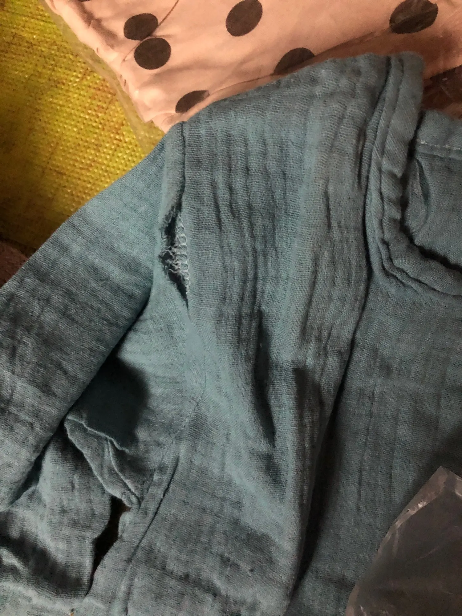 Хорошо, как и остальные предметы из этой ткани. Обратите внимание, что синий очень грязно-голубой. Отверстия в руке кажутся очень большими. Благодаря этому ребенку будет труднее поднимать руки выше. Нам нужно будет посмотреть.