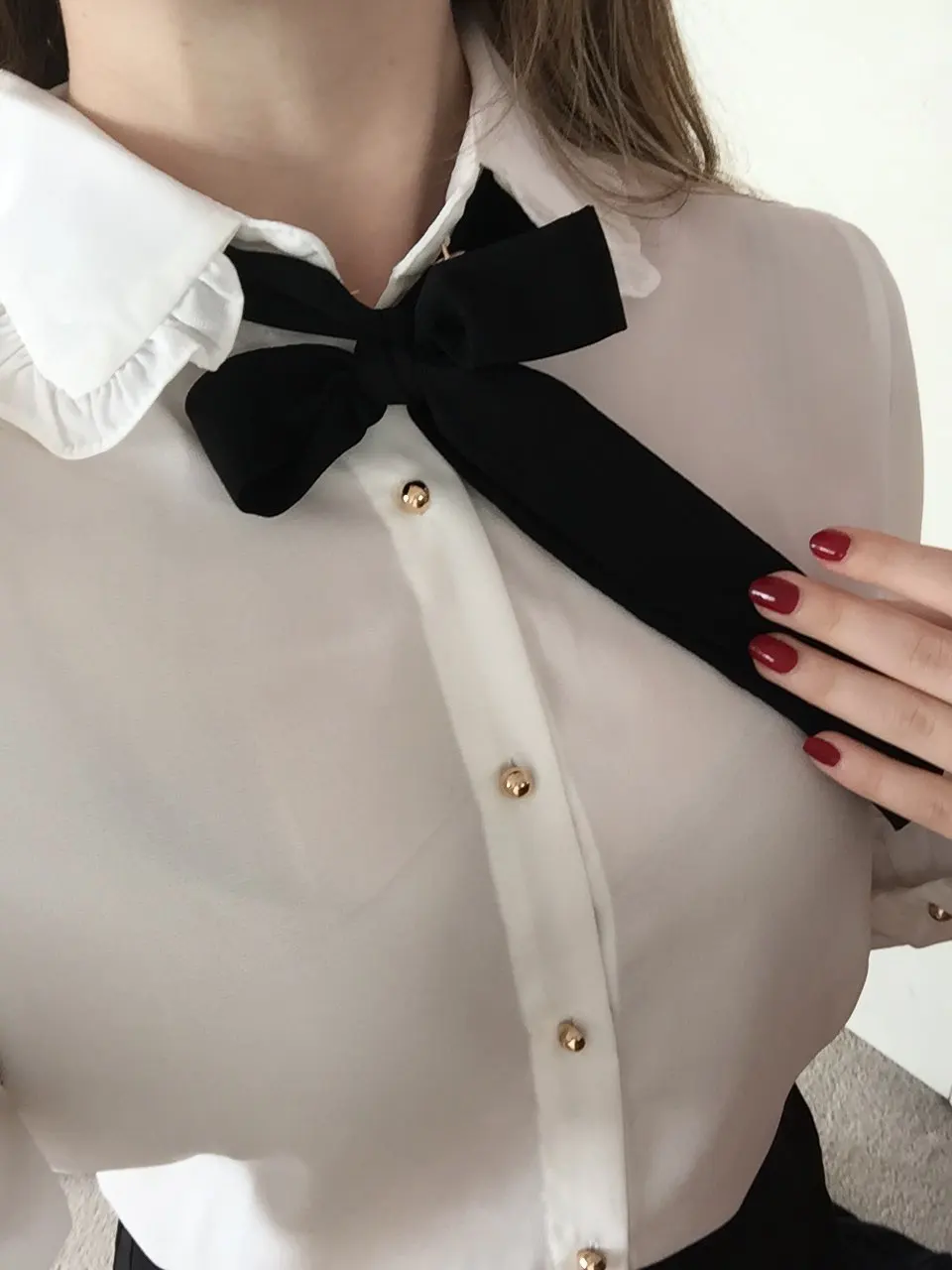 Женская шифоновая блузка с бантом, Повседневная белая рубашка с длинным рукавом, на пуговицах, 2020