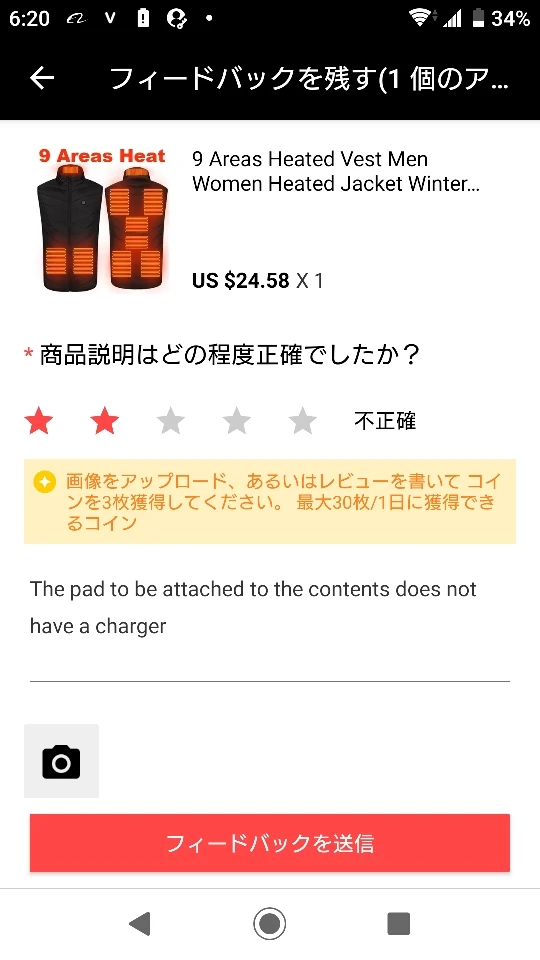 Номер заказа #8119617491109492 Жилет с подогревом для мужчин, женщин, мужчин, 9 зон, теплая куртка, зимний жилет для рыбалки, охоты, тактический жилет с подогревом, Usb жилет для улицы, Veste Chauffante Отправка US $25,59 Здравствуйте, я только что получил свой заказ, и он не имеет ничего общего с товаром, описанным тем, что я заказывал. Только раз, когда он работает не только с блоком питания, только основной розеткой, есть один нагревательный пластырь на шее, который является очень низкой температурой. Внутри нет 9 пластырей, они не работают. Я очень разочарован.