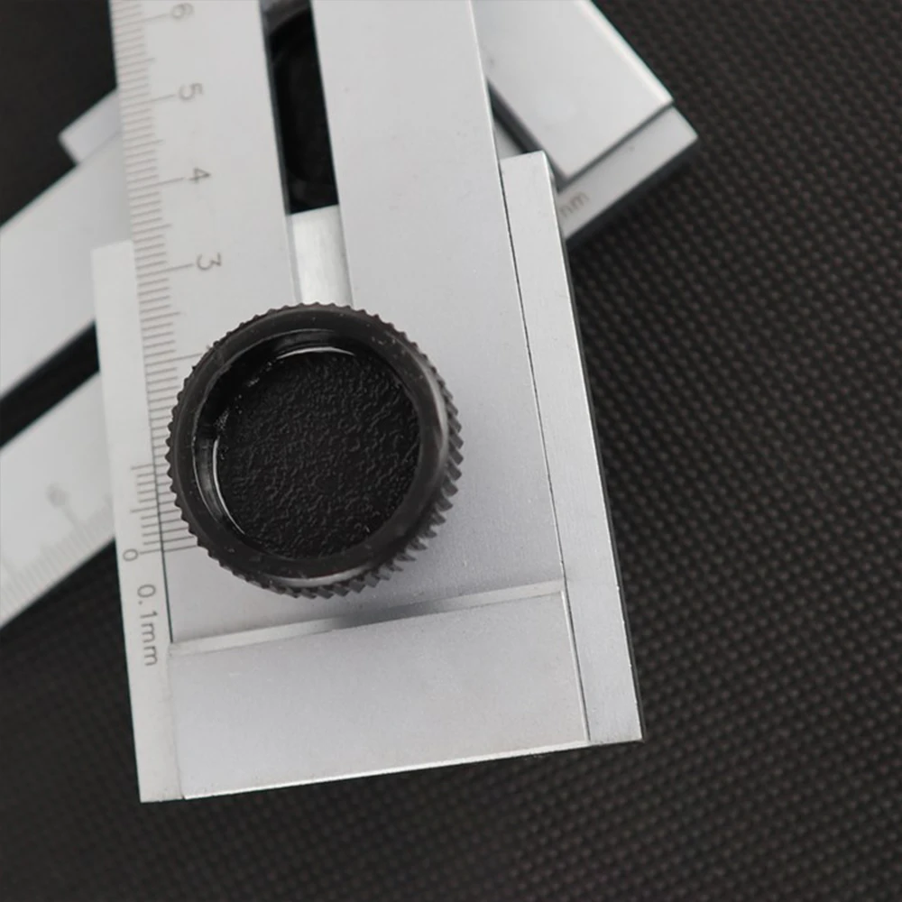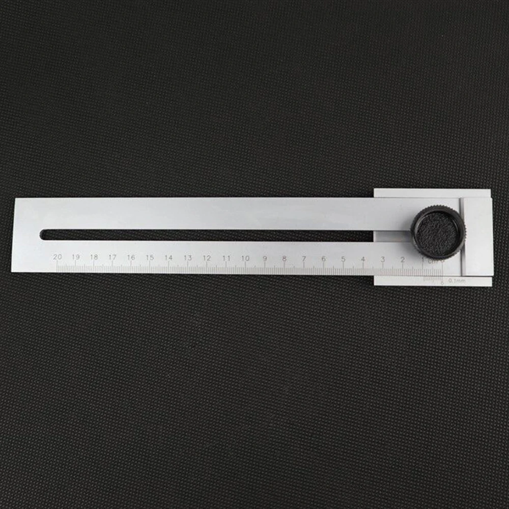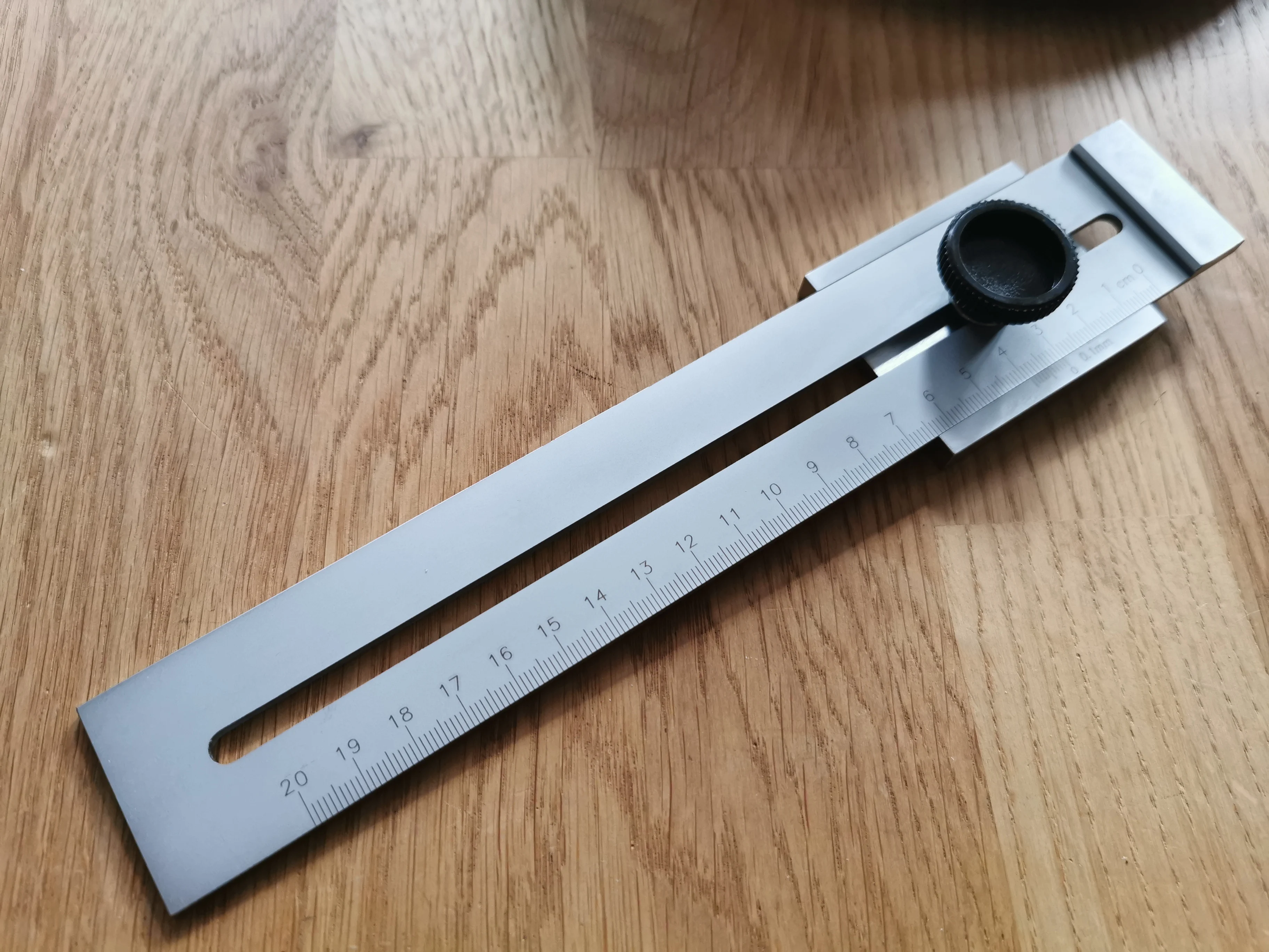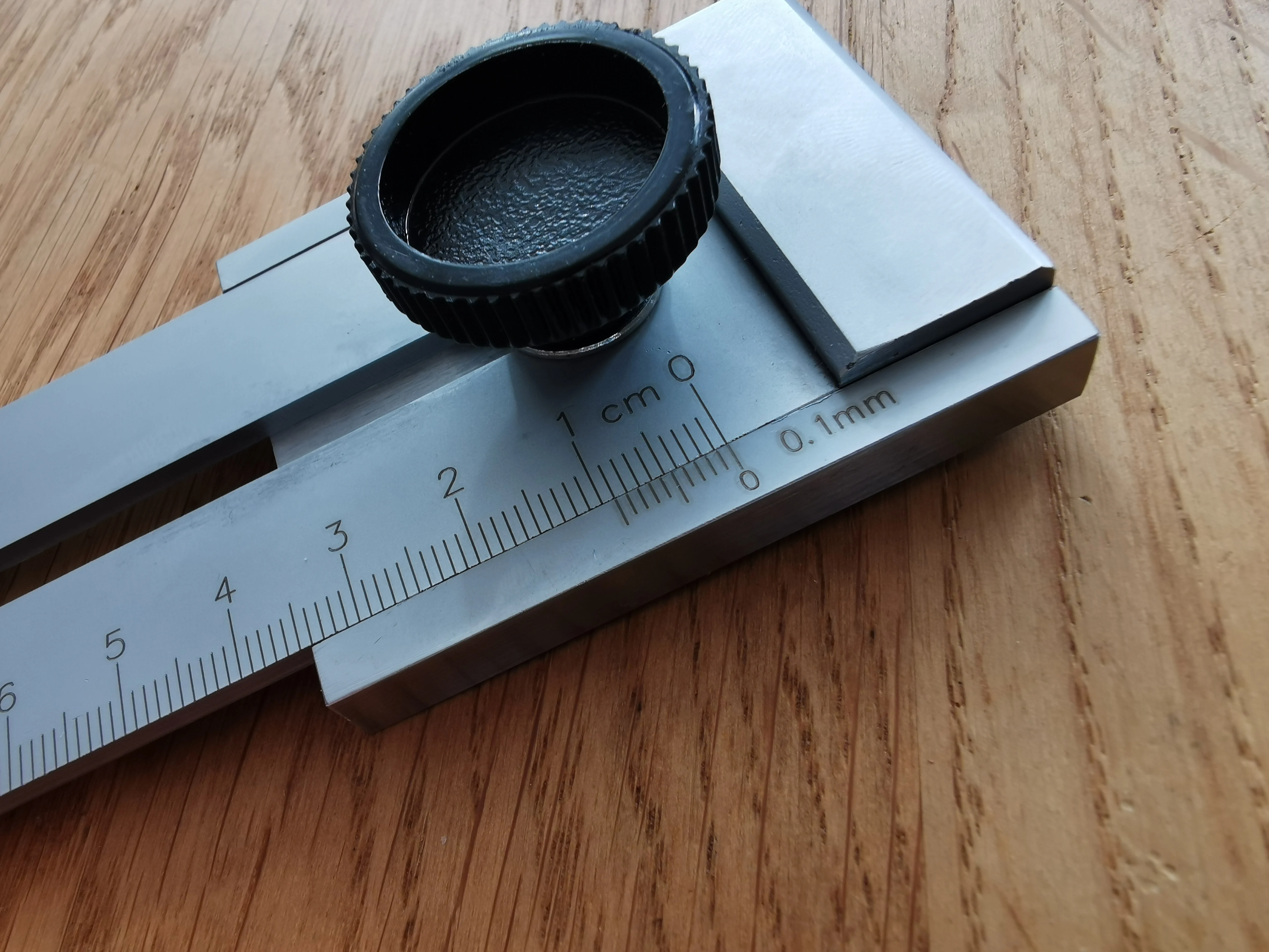 Очень толстый металл 3 мм. Барашек тоже массивный и металлический. Шкала гравирована лазером. Ноль нониуса и шкалы линейки не совпадают (у меня на -0,2 мм), но это не проблема и если нужно, то легко лечится на наждаке. Я убирать не стал, так как меня это устраивает. Линия от карандаша или чертилки всегда получается дальше от торца линейки и как раз две десятки нивелирует это расстояние. Углы забиты, но на работу это никак не влияет.