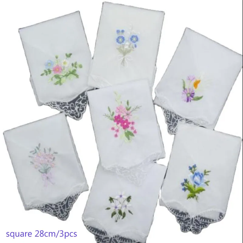 3 шт. роскошные хлопковые женские носовые платки, вышитый кружевной Цветочный носовой платок, цветочный случайный цвет ткани, Женский носовой платок, ткани