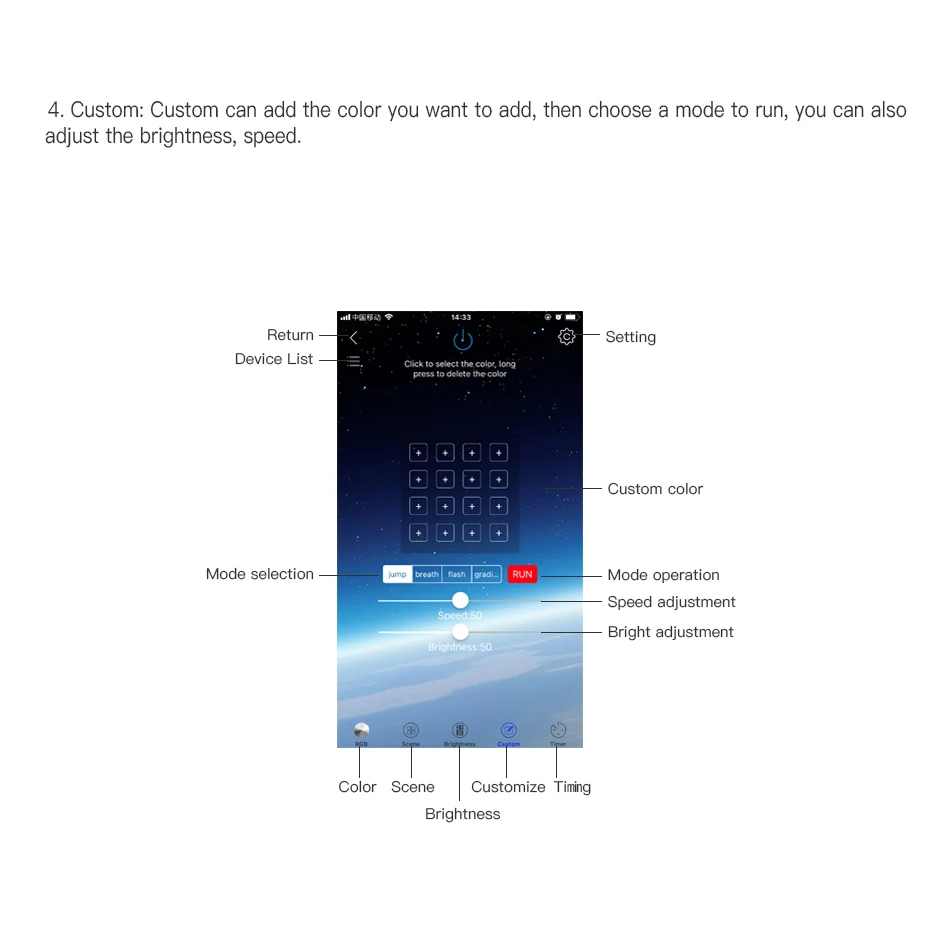 4. Пользовательские настройки: Вы можете добавить цвет, который хотите добавить, а затем выбрать режим для работы, вы также можете настроить яркость и скорость.