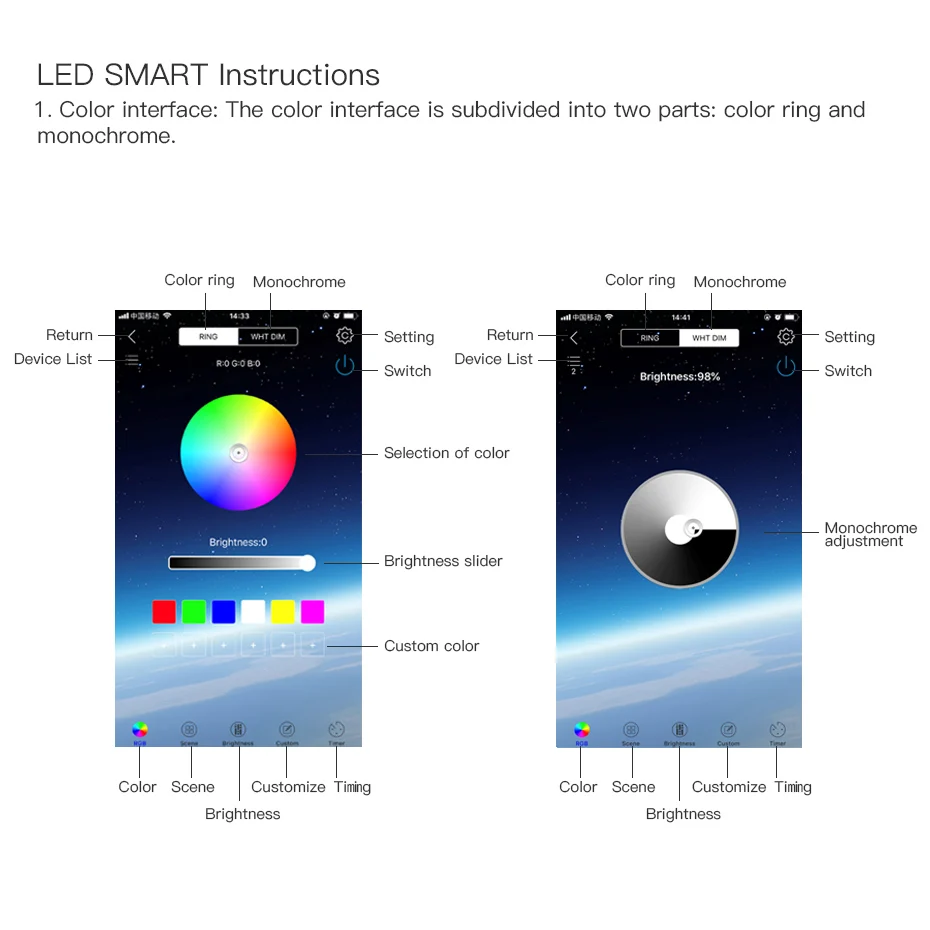 Инструкции по подключению: 1. Мобильный телефон просканирует QR-код для установки приложения (Светодиодная лампа); В APP Store и Google Play требуется загрузить учетную запись; Tencent Po можно напрямую загрузить; 2. После загрузки приложения Подключите мобильный телефон к светильнику Bluetooth. Сначала телефон включается по Bluetooth, затем лампа включается. Инструкция: 1. Цветовой интерфейс: цветовой интерфейс подразделяется на две части: цветное кольцо и монохромный.
