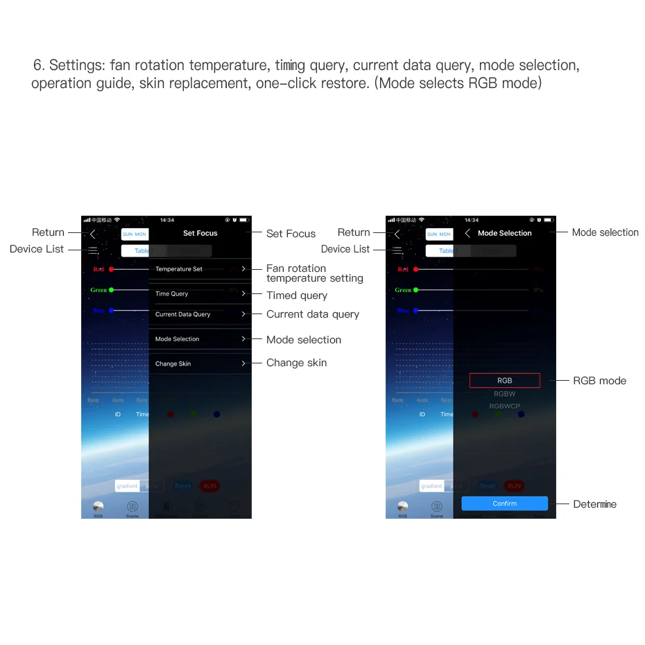 5. Таймер: Таймер cas устанавливает желаемый период времени, чтобы открыть желаемый режим и выключить желаемый режим. Режим включает в себя два режима: прыжок и градиент. Сдвиньте влево и вправо, чтобы установить время, Сдвиньте вверх и вниз, чтобы установить значение цвета, поддержка 15 точек синхронизации. После нажатия кнопки «RUN», появится некоторое время, указанное ниже, вы можете долго нажать время, вы можете настроить время и значение цвета.