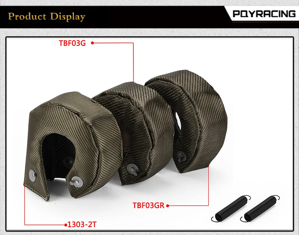 Для t2 , t25 ,t28 , gt28 , gt30 , gt35 и большинства турбо-зарядных устройств t3. Рабочая температура 1200 градусов F Выдерживает прямое нагревание до 1400 градусов F Внешняя Окружность: 19” Внутренняя ширина: около 2-1/2" Материал: 100% полностью Титан Цвет: титановое волокноTBF03GR: