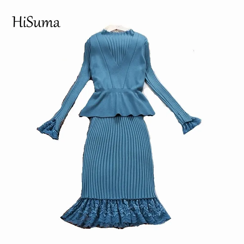 HISUMA 2021 сезон весна; Новинка; Женское платье с длинным рукавом Кружевное трикотажное платье-футляр + v-образным вырезом кардиган с воланами; Детский костюм с жилеткой; Женские комплекты из 2 предметов одежды
