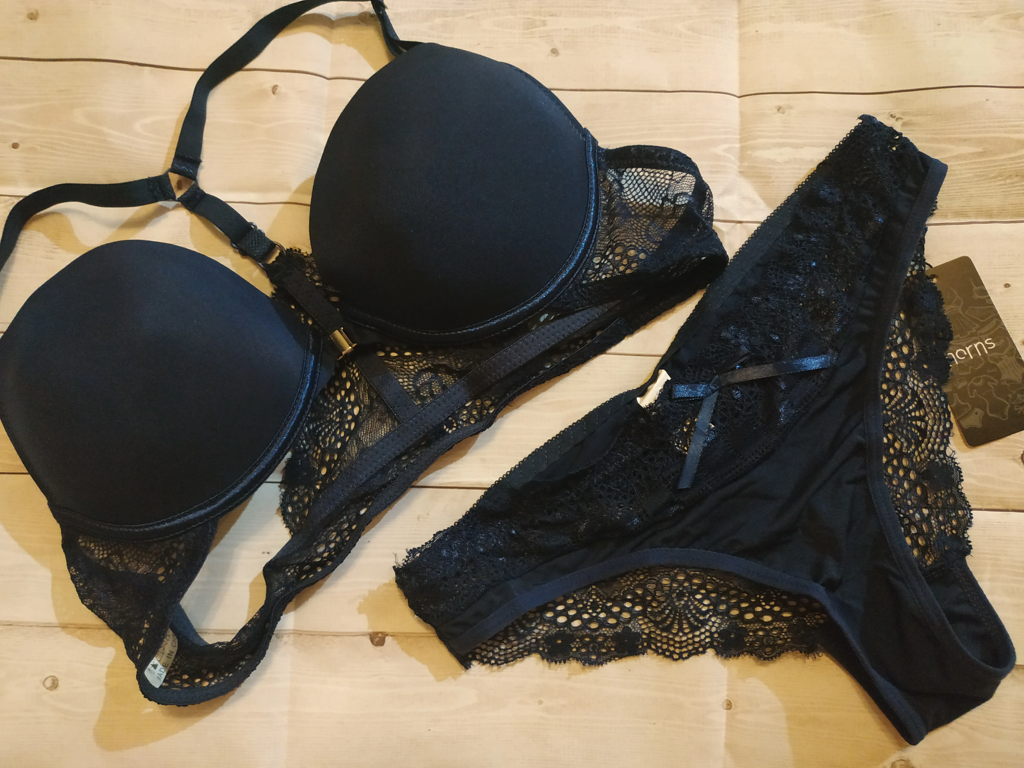 к качеству претензий нет. швы ровные, нитки не торчат и никакого запаха абсолютно. заказывала 80A, но такое ощущение, что чашка совсем не А, а скорей всего В. трусики были М. немного перетягивают. с низкой посадкой.