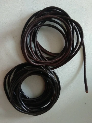 Пахнет кожей и краской. При горении обугливается, яркого запаха нет. Шнур довольно упругий. для браслета хорошо, для плетения будет очень жёстко.
