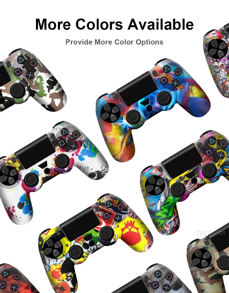Полностью покрытая силиконовая кожа защищает каждый уголок вашего контроллера, избегайте грязи, пыли, царапин, падения ударов, чтобы повредить контроллерСиликоновое трение обеспечивает удобный захват, предотвращает скольжение во время игры, больше не беспокойтесь о потных руках;Очень легко устанавливается и снимается, идеально подходит для контроллера PS4, не влияет на любую функцию;Технология печати воды камуфляж на PS4 контроллер, более модный вид;