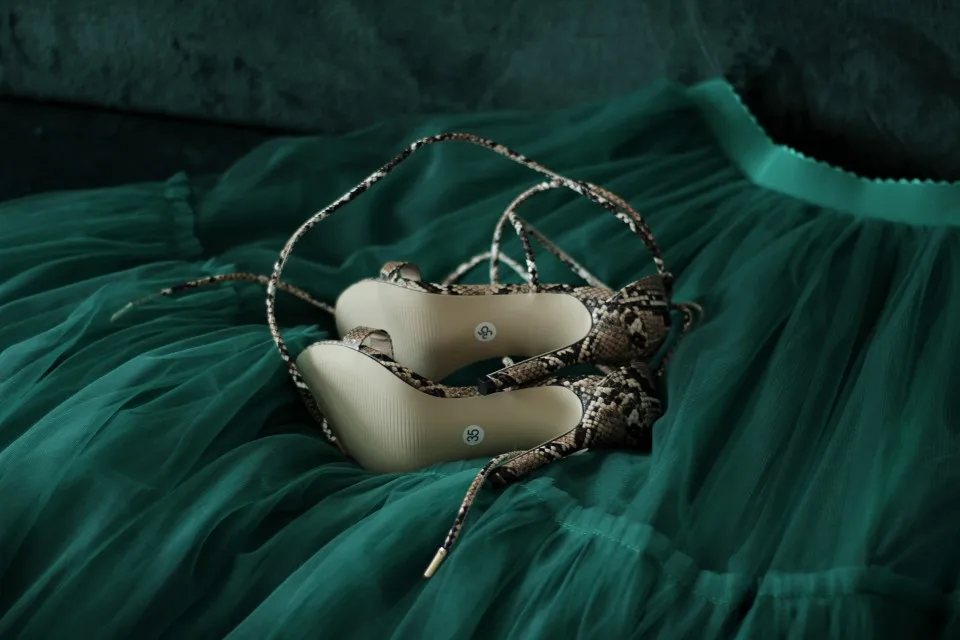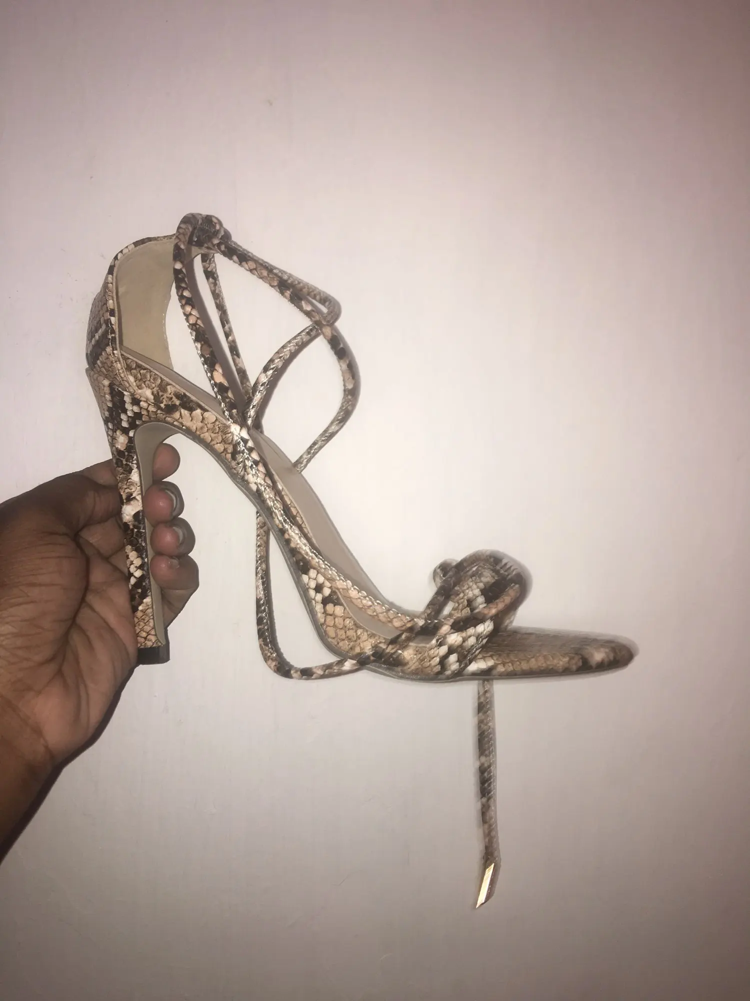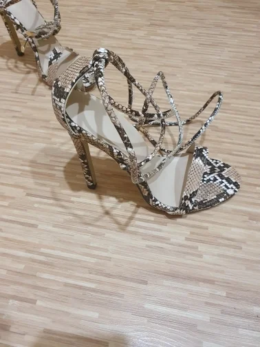 Красивая модель босоножек из искусственной кожи с имитацией натуральной змеиной кожи. Обычно я не люблю хищные принты,но эти босоножки выглядят достойно. Босоножки на высоком и тонком каблуке,пятка закрытая, ступня фиксируется только одним ремешком. Для фиксации на ноге имеются ремешки, которые можно завязать на ноге разными способами. На свой 35 размер я выбрала 4 размер , отлично подошёл. В этих босоножках ножки смотрятся очень красиво,но мне не комфортно , для меня каблук высокий, думаю эта модель для молодых девушек.
