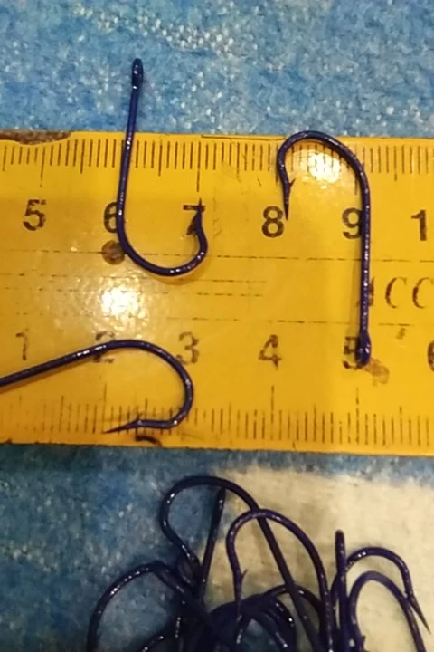 Крючки реально темно-синие. Брал 20 номер. По Российской классификации - это №4, по международной №13. Т.е маленькие. Но красивые. Проверил жало выборочно под микроскопом. Есть хорошо заточенные, а есть не очень. Но все царапают ноготь. Проволока 0,6-0,7 мм.(разными штангенциркулями). Общее впечатление положительное. Продавцу спасибо!