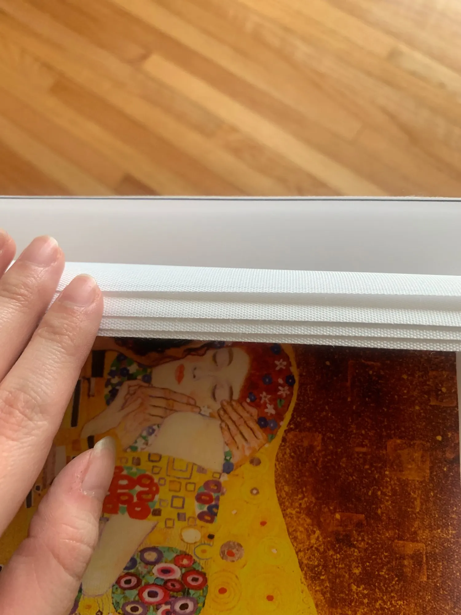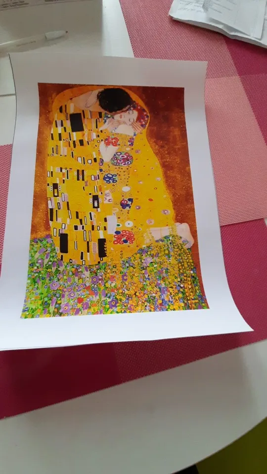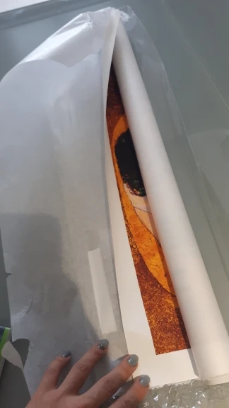 Прибыл очень быстро, приятный материал. У него есть белая граница, которую мне нужно было вырезать, чтобы он поместился в стеклянную раму того же размера, который я получил отдельно