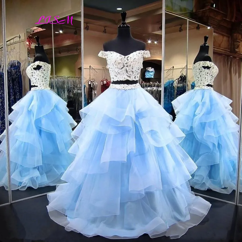 Светильник-Голубое Бальное Платье из двух предметов, кружевное вечернее платье с открытыми плечами и оборками из органзы, милые длинные платья для выпускного вечера 16 шт.