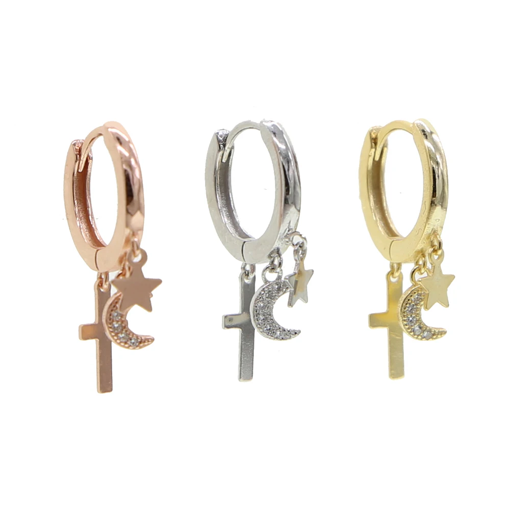 2021 Новая мода Простой дизайн 925 стерлингового серебра крест Звезда Луна Cz Шарм Висячие серьги женские изящные вечерние ювелирные изделия