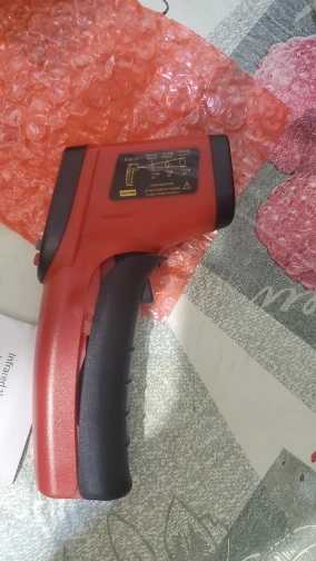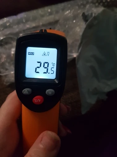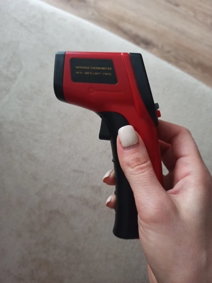 Посылка в Киев доехала за 1,5 мес, упакована в обычный пакет с пупыркой, запросто могли угробить при доставке, но работает. Сборка очень хлипкая, клавиша измерения срабатывает, если нажимать не на середину-низ рычага, а на самую его верхушку у основания пирометра. Батарейки (2 шт ААА, в комплект не входят) не плотно сидят в своих гнездах, нормально не фиксируются. На пирометре есть 3 кнопки: изменения градусов по C и F, вкл/откл лазерного указателя и вкл/откл подсветки. Обратите внимание, что пирометр предназначен исключительно для материалов, у которых коэффициент эмиссии составляет 0,95, для всех остальных материалов будет очень большая погрешность измерения - именно поэтому температуру тела показывает как 29-30 С, температуру кипящей воды 90-92 С. Он для этого просто не предназначен. Я планирую использовать его для темперирования шоколада, но все этапы откалибрую с помощью контактного термометра, сравню результаты на двух и буду ориентироваться уже по сверенным измерениям пирометра.