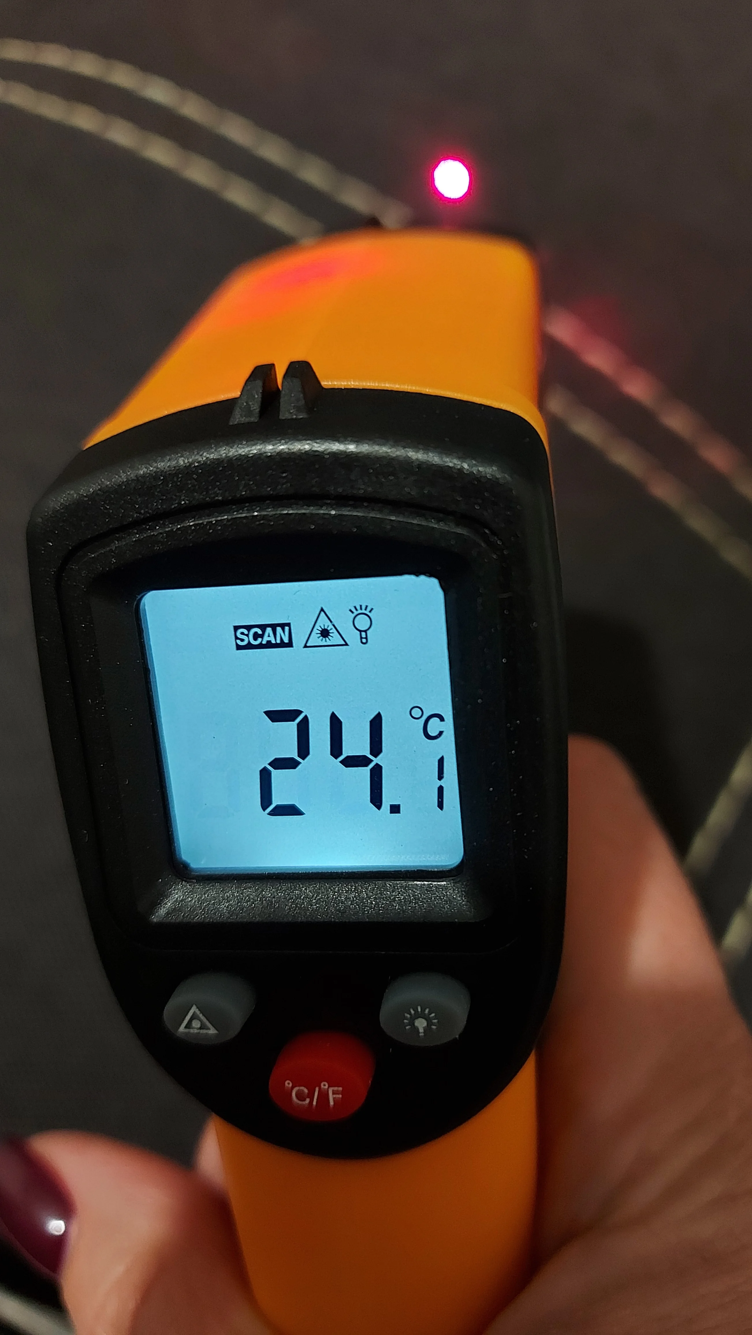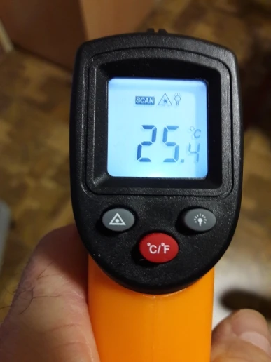 Посылка пришла в Днепр на укрпочту за 33 дня. Внешне градисник смотрится неплохо, но температуру точно не померять. На кипящей воде показало 89 градусов. На улице в +1 показало -2. Температуру тела тоже точно не померяеш. Лазер светит немного в сторону.