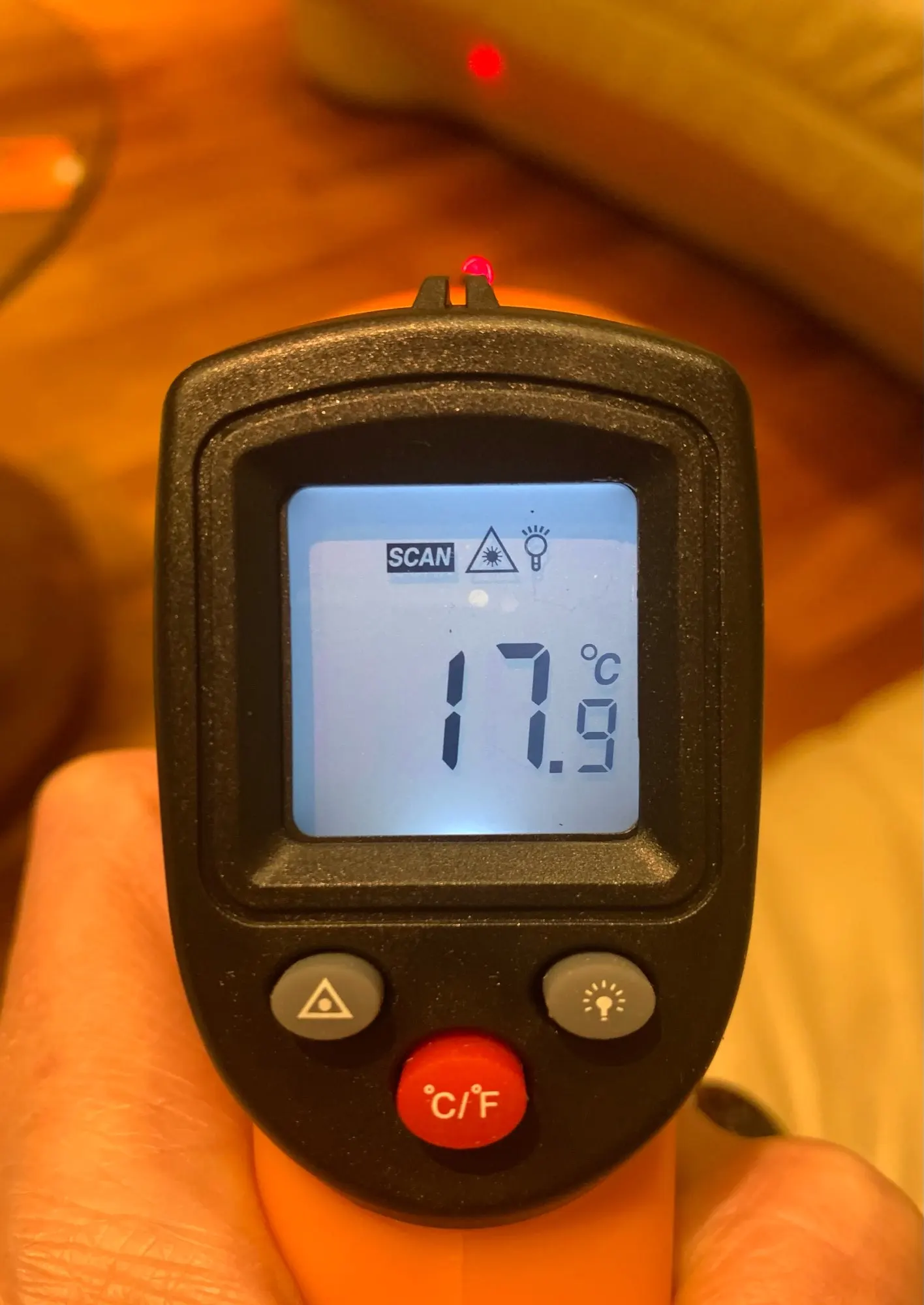 Рекомендую! Доставка 2 недели УкрПочтой. При включенном лазере измеряет t° в конкретной точке, без лазера - t° окружающей среды. Показания прибора, квартирного и уличного градусника совпадают. Работает как с подсветкой, так и без.