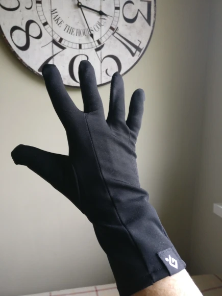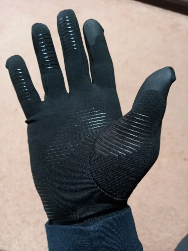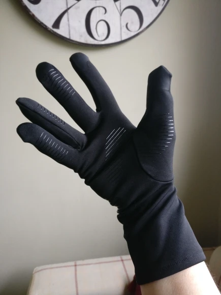 Перчатки приятные на ощупь, плотно прилегают, тянутся неплохо. Немного отталкивают влагу, но не думаю что это надолго. С сенсорным экраном работает хорошо, но к сожалению не с защитным стеклом - пока не нашел перчаток которые с ним работают