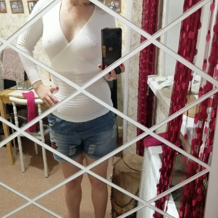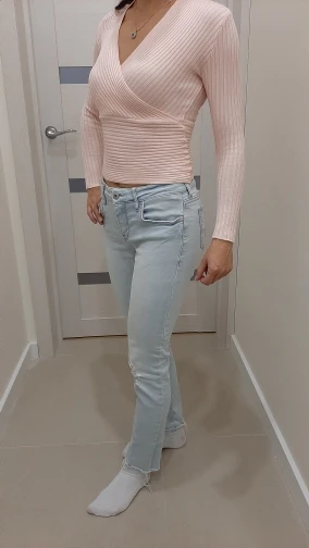 Кофточка как на фото у продавца, материал не плотный, на просвет просвечивает. На рост 165 чуть ниже пупка. С джинсами/юбками высокой посадки можно носить. На параметры грудь 86,талия 66 отлично. Размер 42. Думаю будет смотреться хорошо максимум до 46. Пришла за месяц в Португалию.