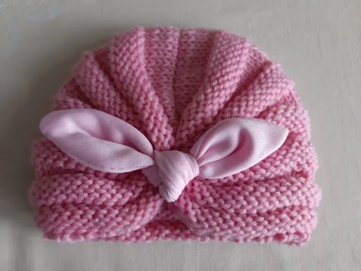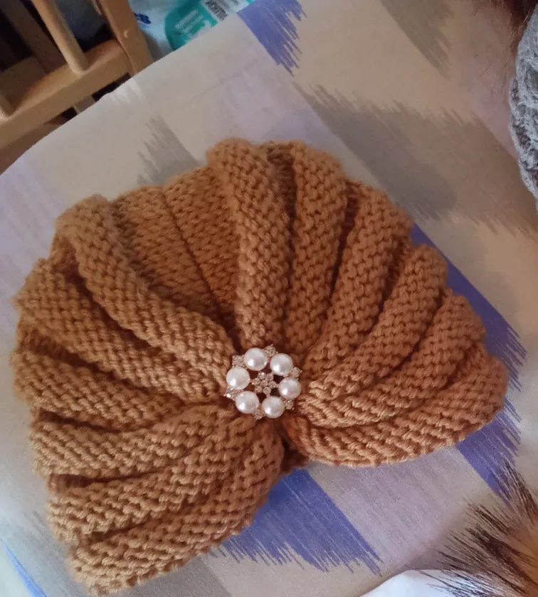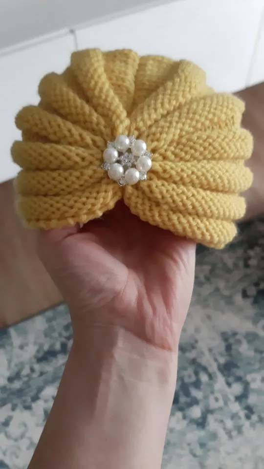 Красивая шляпа с другой стороны, узел не желтый, как на фото, но оранжевый, в противном случае размер очень хорошо подходит для головы ребенка