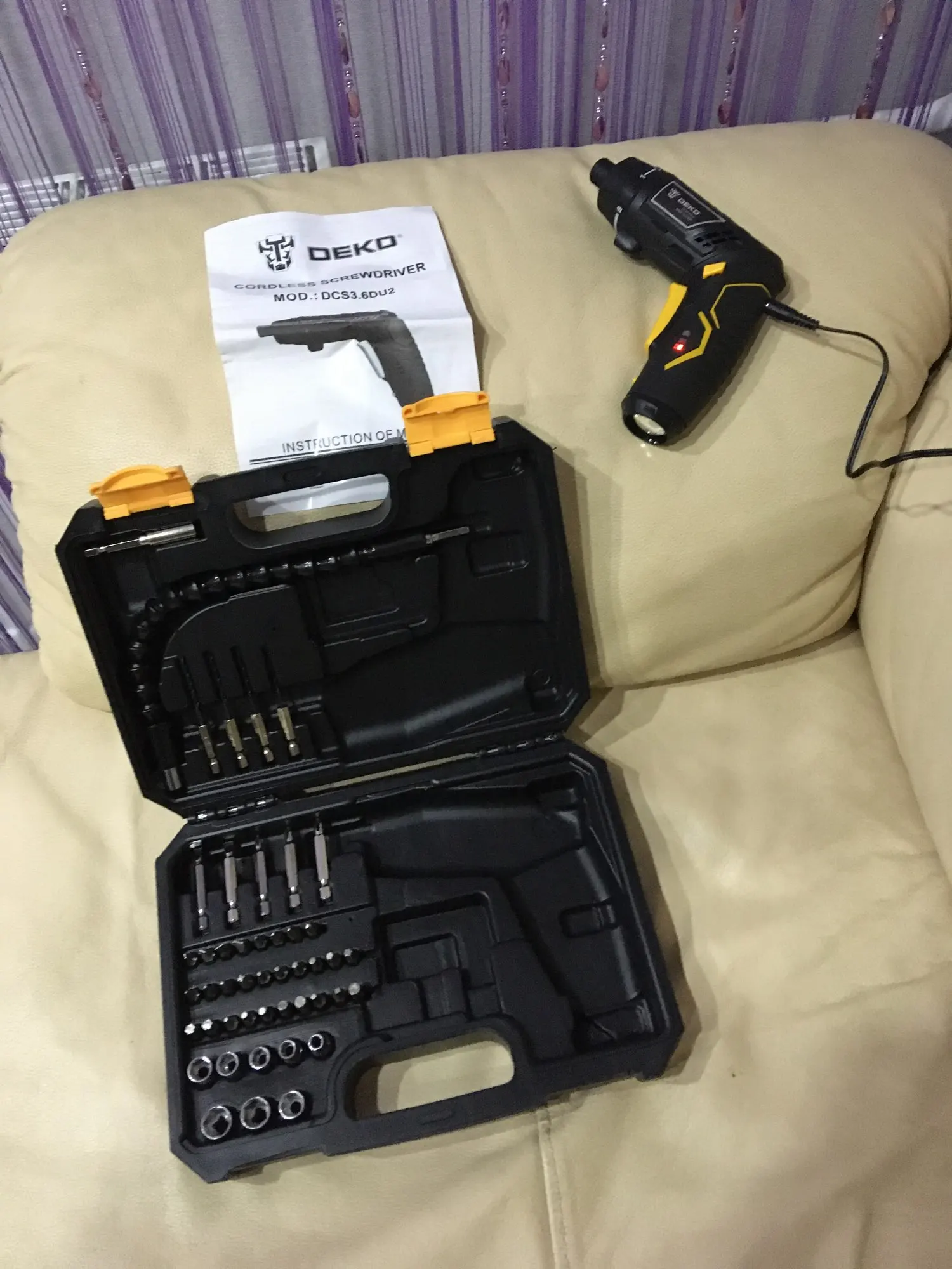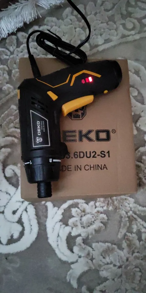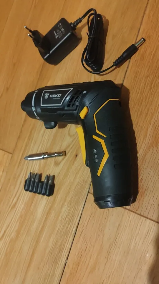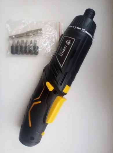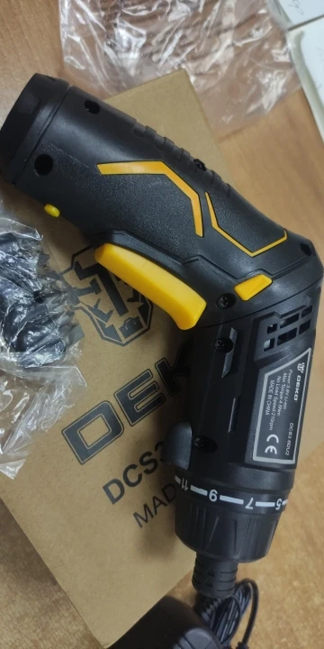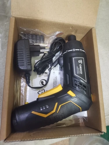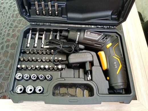 Очень быстрая доставка 5 дней со Одесского склада в Украине. "Укрпочта". В посылке фирменный бокс "DEKO" в фирменной упаковке. В пластиковом боксе: электро-отвертка "DEKO", зарядное устройство 5,5В, очень много насадок для винтов, шурупов, гаек на все случаи жизни (смотри фото №3), гнущийся удлинитель для насадок, 4 сверла, универсальный держатель и инструкция. Супер шикарная комплектация! Все сделано аккуратно и точно. Отвертка имеет два положения - изогнутый и прямой. В ручке отвертки вмонтирован яркий фонарик. Есть кручение в обратную сторону. Регулировка закрутки. Индикатор зарядки и разрядки. Реально все круто. Покупал на дачу, но решил оставлю дома, а на дачу закажу еще такой же. Надежный магазин. Удачная покупка