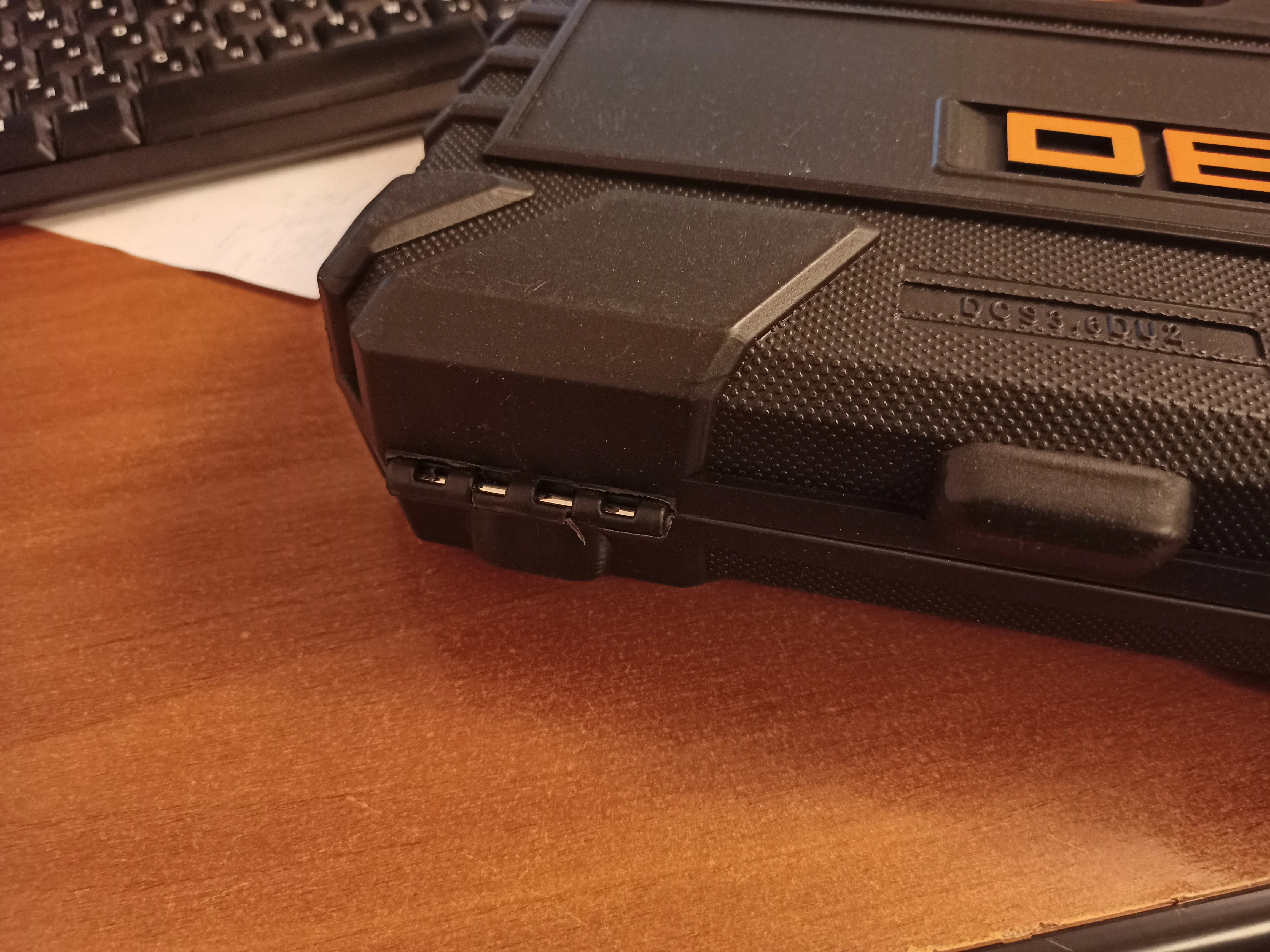 Отвертка порадовала наличием ограничителя усилия, а также фонариком в ручке, подсветкой и индикатором заряда. Ручка прорезинена. Своих денег (я купил за 21$) стоит. Кейс недорогой, но с нормальными петлями и защелками. Единственный момент, который не понравился усилие на минимуме достаточно большое для отвертки. Но это абсолютно у всех отверток и шуруповертов в этом ценовом диапазоне.