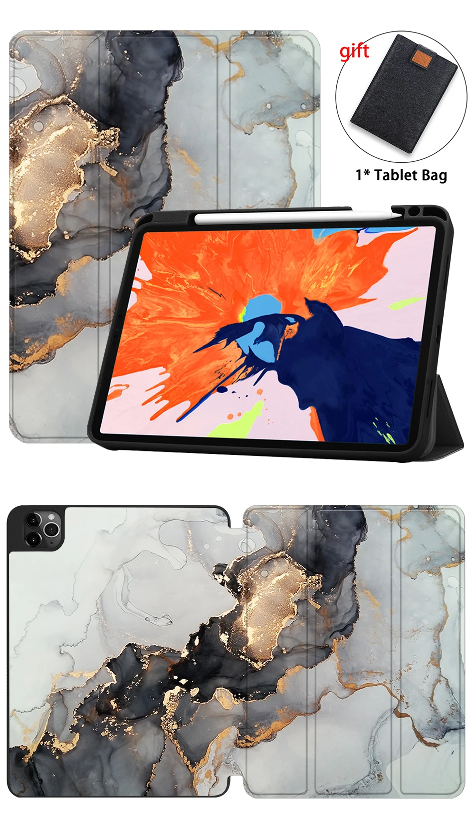 [Трехстворчатая подставка]:Встроенные магниты, складываются в подставку. Трехстворчатая передняя крышка с двумя стоящими позициями для комфортного ввода клавиатуры и просмотра фильмов с углом обзора, который отличается от трехкратного.