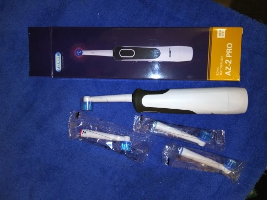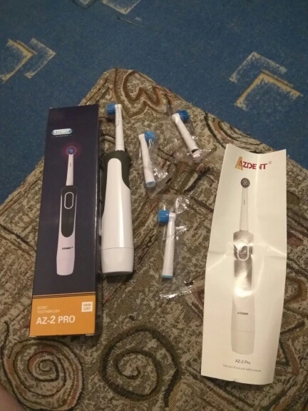 Товар пришёл быстро, меньше месяца. Коробка пришла в идеальном состоянии, инструкция со сменными головками в комплекте. Уровень шума приемлемый - не слишком громкий и не слишком тихий. Зубы чистит очень хорошо. Есть таймер, и это плюс.