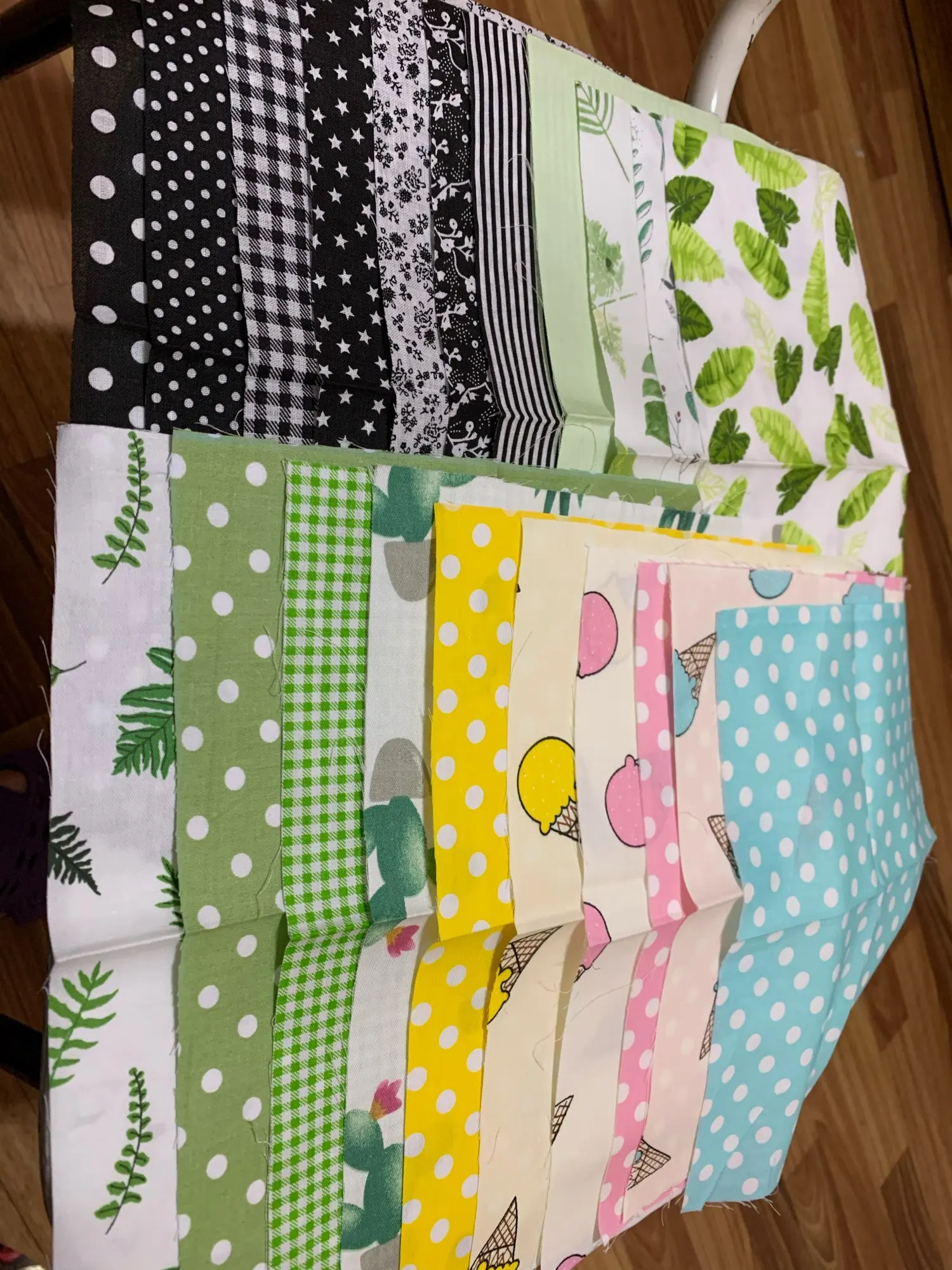 Ткань хорошего качества, в меру плотная, яркая, соответствует представленному фото. Лоскуты в розовом и зелёном цветах на 2 см больше лоскутов жёлтой и сиреневой. Хорошее качество, для поделок очень хорошо. В подарок продавец положил лоскут голубой ткани и набор ниточек. Спасибо продавцу за качественный товар, очень рекомендую, буду ещё обращаться к этому продавцу. Доставка быстрая.